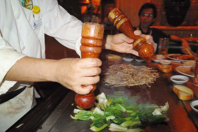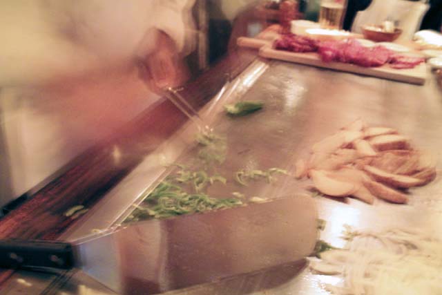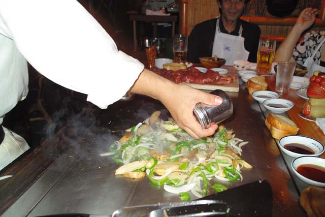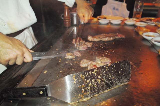 目の前の鉄板でステーキを焼きながら、塩とコショーをクルクルカチカチまわして、忙しなく肉を切り刻んでいく。