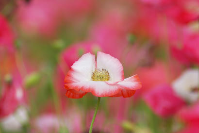 行ってみるとご覧のとおり、あたり一面ポピーです。ですので今回も、世羅でご活躍頂いた望遠に頑張ってもらいました。 一輪狙うのも面白いかな。 縦位置も奥行きが出ていいですね。気に入ったコマは、ワイド四ツとかにプリントすると楽しいので、後で焼いてみましょう。 もちろん望遠だけでなく、寄った写真も面白い。 ぽっと一輪白い花も。 赤は破綻気味ですが、それがかえって面白いかも。夏にはまたヒマワリもあるし、菜の花の時期もあるし、ベーファームまた来よう。