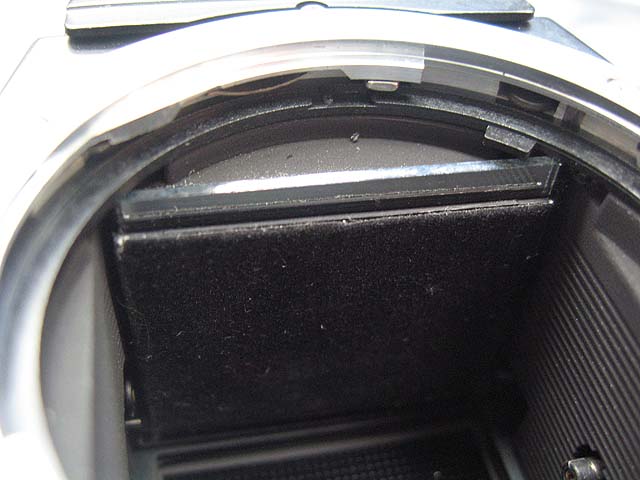 ミラーが台座より下にずれて(この写真では前に出てきて)、明らかにレンズの邪魔をしていると言う感じになっていますね。