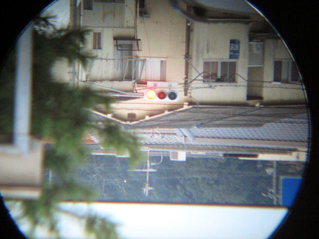コンデジを接眼レンズに当てて写してますので、実際よりぼやけてますが、目で見た映像では、信号の下の文字もくっきりはっきり見えます。
