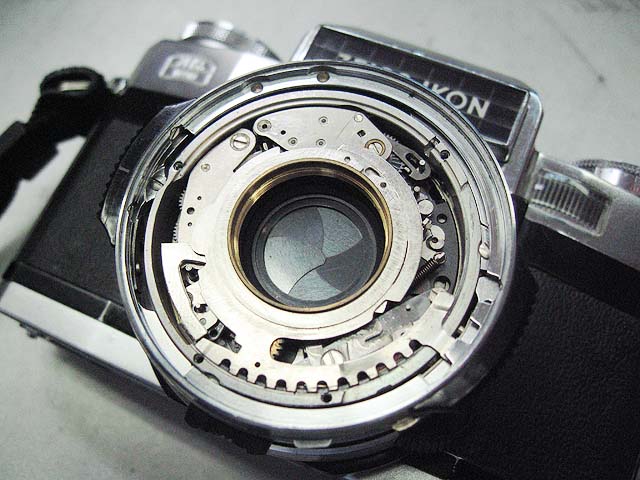 レンズが外れてシャッター羽根が直視できます。