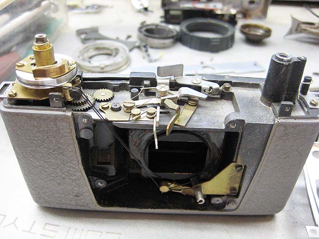 次の写真はレンズユニットやら前面プレートやらを外した状態です。 ボディー側とリンクしているものと言えば、右下の露出計を動かす仕組みのところと、上側のシャッターセット及びリリースのリンケージ位しかないと思うんですが。 それの位置合わせにシムでシビアにやることは無いですよね。 ま、いいや。 それと、上の写真で分かるでしょうか。レンズユニットが付くあたりのシュラウドなんかにも劣化した接着剤が付いています。 この辺も全部外して掃除して、再接着しましょう。 ここまで掃除して、やっと全体的にすっきり感が出てきた感じです。 で、昨日の記事の終わりに出てきた透明の帯状の部品は、 ここに付くようです。 本来はオレンジか赤のセロファンみたいのが端にありましたが、劣化して再使用不可能でしたので、その部分にはプラモデル用のクリアレッドを塗りました。 外側から見ると この溝のカバーだったんですね。 どうやらここにはASA感度設定用のパーツに付いていた棒状の部分がインジケーターとして見えるようになるようです。 多分この透明パーツが取れて、それに引っかかってインジケーター部分が曲がってしまったのでしょう。 はい。これで大体きれいになりましたので、組みなおしましょう。 でも待って下さいよ。 昨日レンズユニットから出てきた この黒い小さなプラスチック部品。 どこに付ければいいのでしょうか。 さっぱり分からないので、とりあえず無しで組みましょう。 先程のインジケータは こんな風になります。 リングをずっと回していくと、 「B」とかに持っていくことができ、バルブになったりします。 このリング上に、 ASA感度設定もあります。 きれいに掃除したファインダーは ご覧の通り、よく見えるようになりました。 前面プレートに少しだけあるレザーは、 ボンドで貼らずに、両面テープにしときましょう。 と言った感じで、 出来上がり。 では今度はお楽しみの試写です。