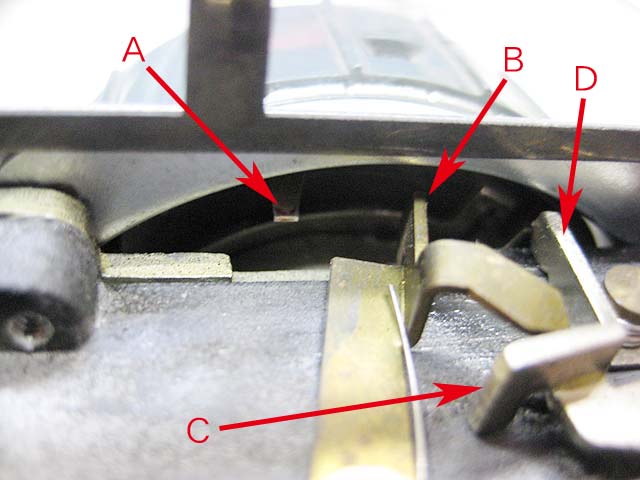 露出計を回すシステムも分解しましたので、どうせ露出はズレているでしょうと思っていました。ですから、どのぐらい修正すばいいかの目安を知るためにも、一回写してみようと思っていたんです。 が、意外にも、適正露出です。 例によって逆光でも、 結構よく写ってますね。 真ん中の白い建物の二階あたりに少しハレーションの影響のような感じはありますが、まあいいでしょう。 絞り込んだ状態だからいいのでしょうか。 そしていつものプジョーです。 まあ当たり前に写ってます。 普段使う分にはいいカメラのようです。 絞りが開いていくとどうでしょうか。 まだまだ開放ではありませんが、よく写ってます。 室内では? これでほとんど開放ですね。 ピント自体はどうやら目測通りで合ってるようです。が、この開放での撮影だと、四隅に周辺ボケが出てくるようです。 まぁこのカメラの場合、絞りとシャッタースピードの組み合わせが固定されているプリセット式マニュアルですから、自分で絞りを決めて写すことができません。 なので、開放での撮影はほとんど限られることになりますので、カメラの性格上気にしなくてもいいかなと思います。 そうそう、このコニカLのように、シャッタースピードと絞りの組み合わせが初めから決まっていて、その中から適正露出になる組み合わせを見つけると言うやり方のことを、よくプログラムと言ってる事が有ります。 でも私にしてみれば、組み合わせの変化が無いのでプログラムとは言いにくい気がしています。 しかも、オートではない。 なので、このブログでは、「プリセット式マニュアル」と呼ぶことにします。 以前にも書きましたが、フジカST-Fもこの方式です。 話しは試写に戻って、写していると何かシャッター切ってないのに巻き上げできるような気がしてきました。 なので、1回巻き上げて、シャッター切らずにもう1回巻きあげると… あれ、巻き上げできます。 どうやらシャッターセットの機構がちゃんと組めてないようです。 ではもう一回開けてみましょう。 すると、 ああ、分かりました。 Aのレバーが本来ならBのリンケージの右側に来てないといけなかったんですね。 Dが左に押されてシャッターセットが行われますが、その時Aも一緒に左に動いていきます。 その時、Bも左に行くことで、Cに引っかかっている部分が外れて、Cが前に寄っていきます。 するとCがDの邪魔をする格好になって、巻き上げようとしてもDが動かないという仕組みです。 ですが現状ではAがBを左に動かすことができませんから、Cの位置も変わらず、その結果邪魔者がいないので、Dは何回でも左右に動くことができ、巻き上げは何回でもできてしまうわけです。 ではこのリンケージの位置関係を直して、コニカL完成です。