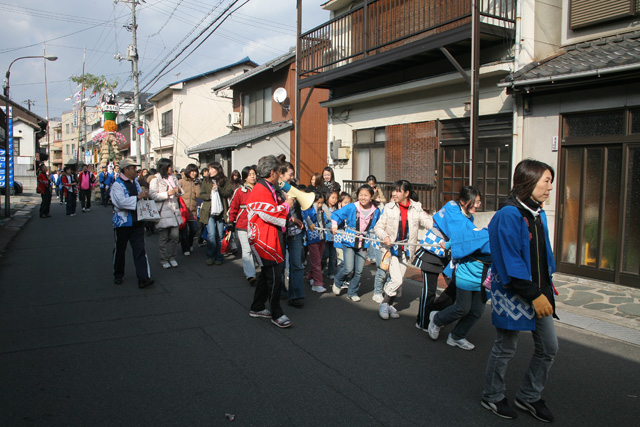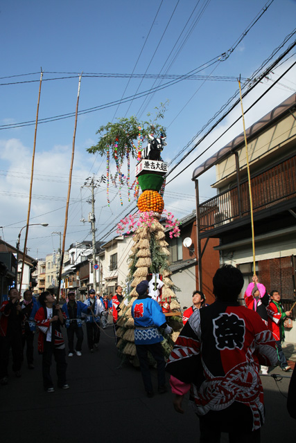 この写真のように、背が高くて電線に引っかかってしまいますので、ながーい竹竿で電線をよけながら進んでいきます。時にはとんどを斜めに寝かせながら。