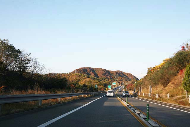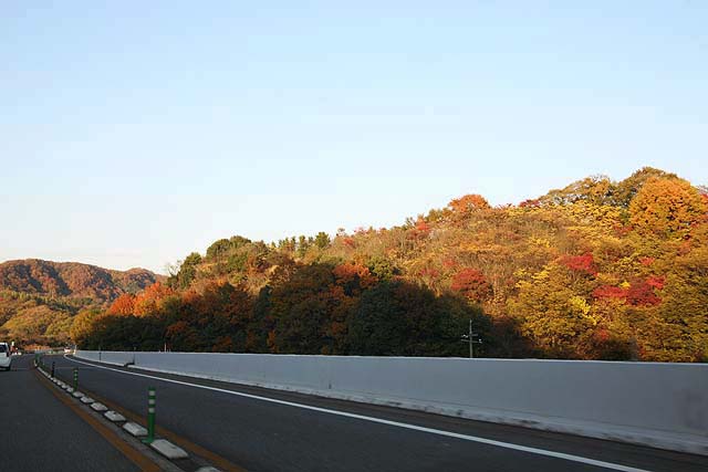 因島に行く用事があった帰り道、因島北インターから向島インターまでの道すがら、先に見える山や、両サイドの木々がいろんな色に色付いています。