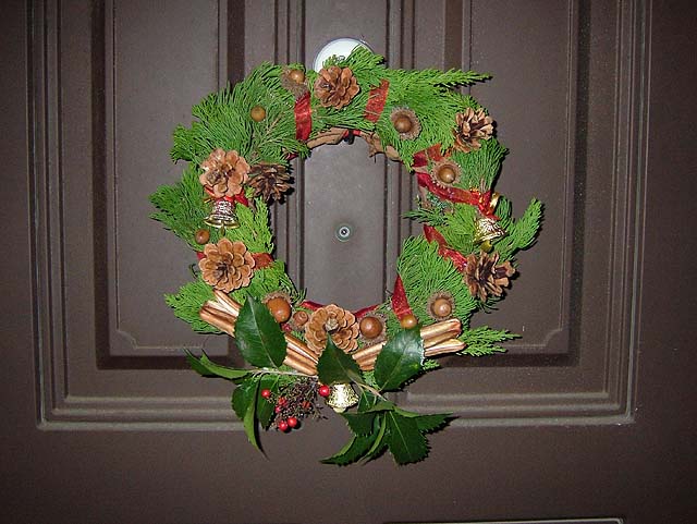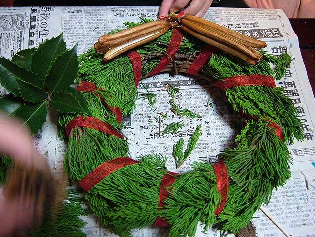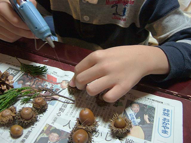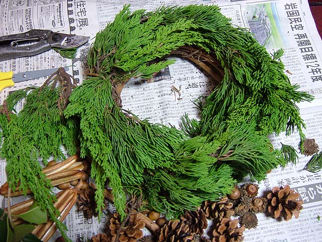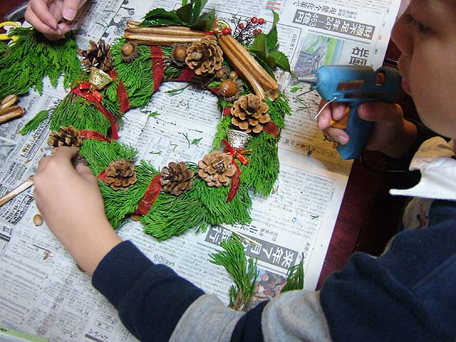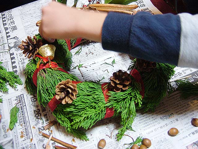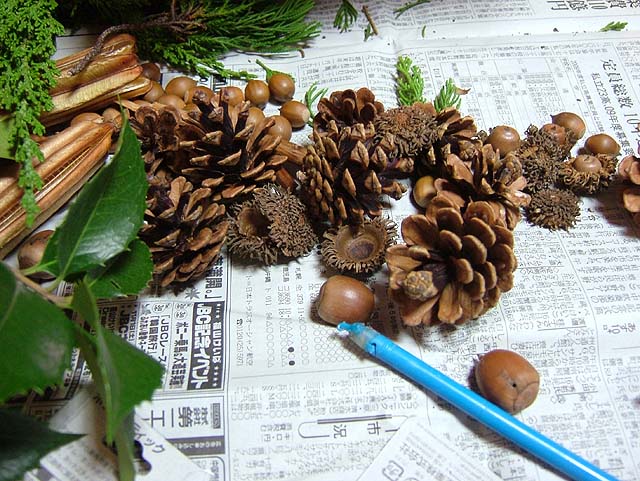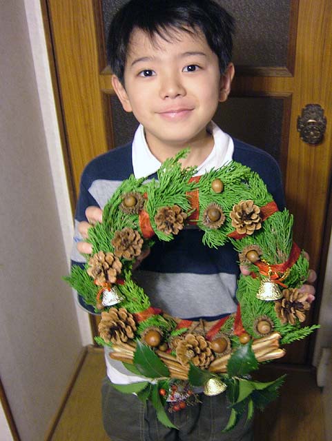 材料はもちろん、先日吉備路に行った時に集めてきたマツボックリやらドングリやら。 リースのベースの環っかも買って来ました。 でもそのベースを飾るための常緑樹の葉がありません。 ベースだけだと茶色くてなんか地味になってしまいます。 ということで、こども店長と裏の山に探しに行くことにしました。 と、うちのすぐ隣の家で庭木の剪定をしていました。 もしかして、と思って行ってみると、 いいのがありました。 剪定して捨てる枝をまとめてある中に、常緑の葉があるじゃないですか。 しかもヒイラギの葉も有ります。 お隣に断って、使う分だけもらってきました。 なんてラッキー。 では早速ベース作りをしましょう。 常緑樹を付けただけではボワッとしてしまいますので、リボンで巻いて形を整えます。 形が整ったら、飾り付けに入りましょう。 ホットボンドを使ってくっ付けると簡単ですね。 ドングリと帽子が取れないようにくっつけて、 マツボックリやらもバランスよく付けていきましょう。 小物で買ってきたベルも付けて、 糸を引いてるホットボンドのあまりを取って、 もう一度形を整えたら、 はい、出来上がりです。 ではでは、玄関の扉に飾りましょう。 飾るための取っ掛かりがありませんので、吸盤付きのフックが便利ですね。 これでサンタを迎える準備の一つは終わりました。 次はツリーを出しますか。 そうそう、リース作りで余った材料を利用して、小さめのリースをもう一つ作って、材料を頂いたお隣にお返しに持って行っときましょう。