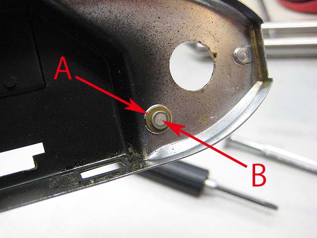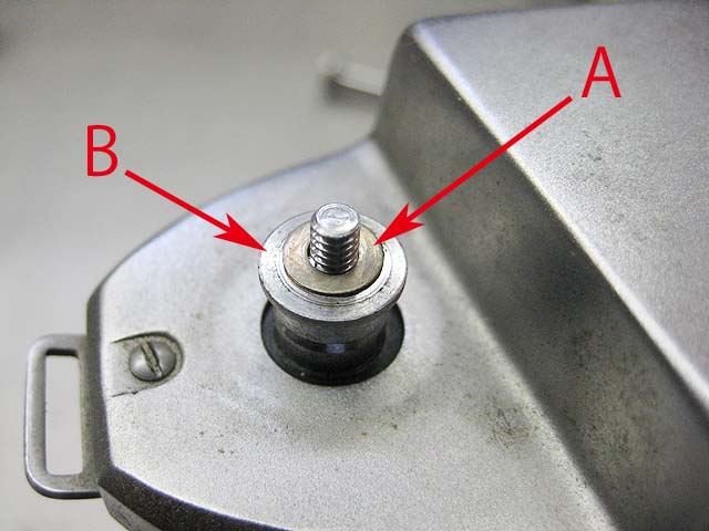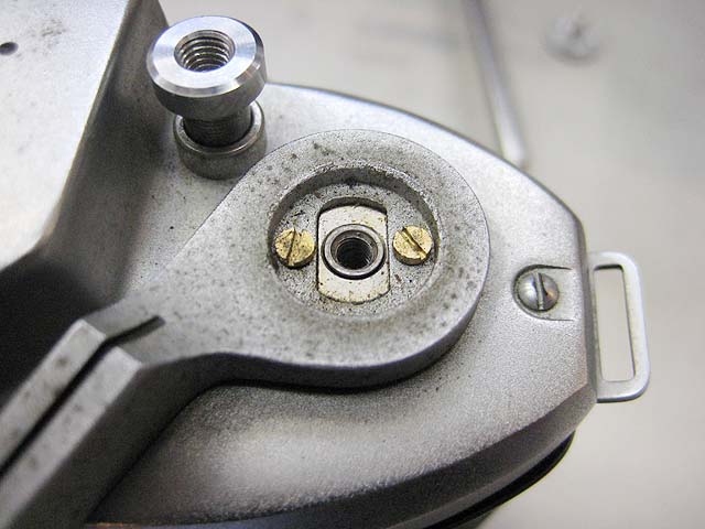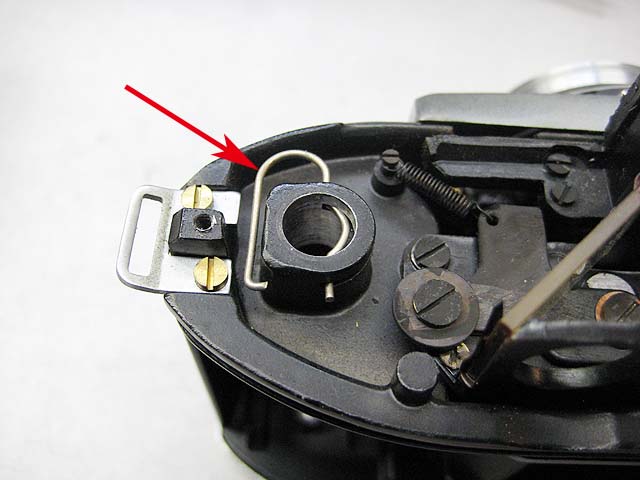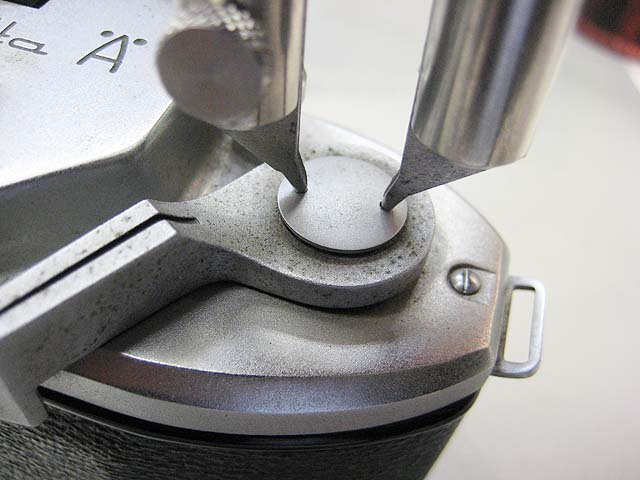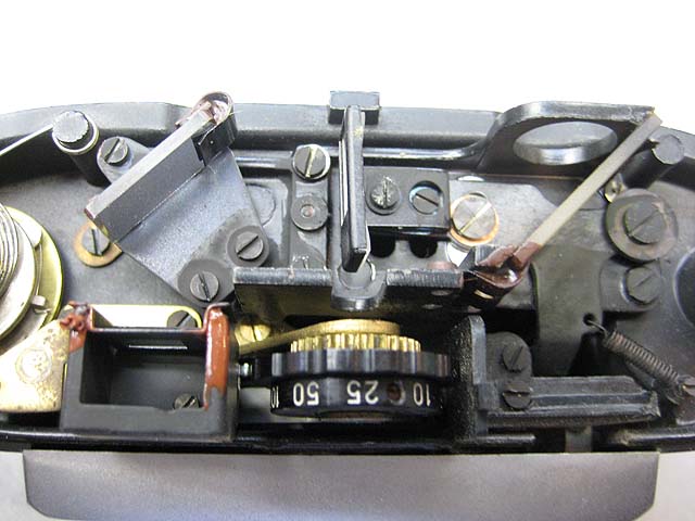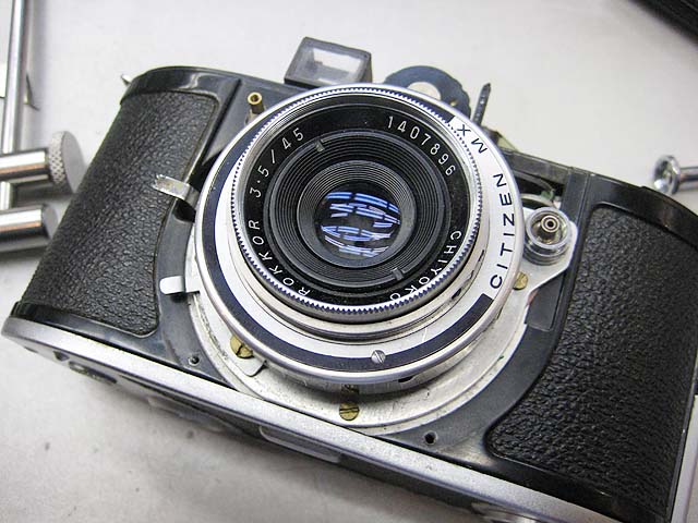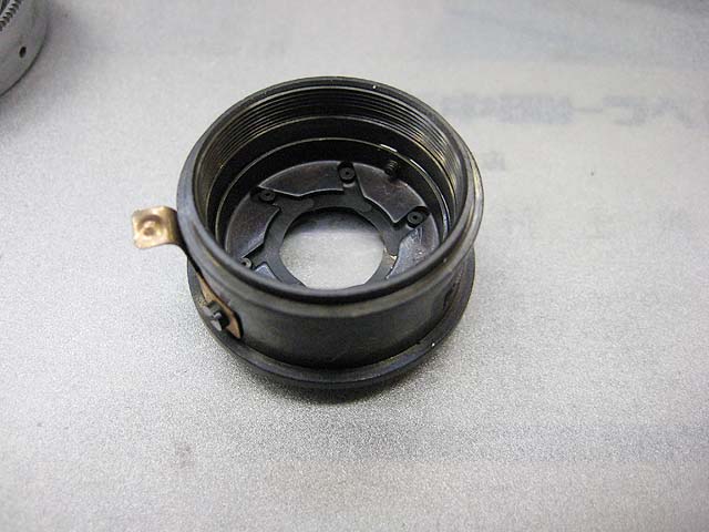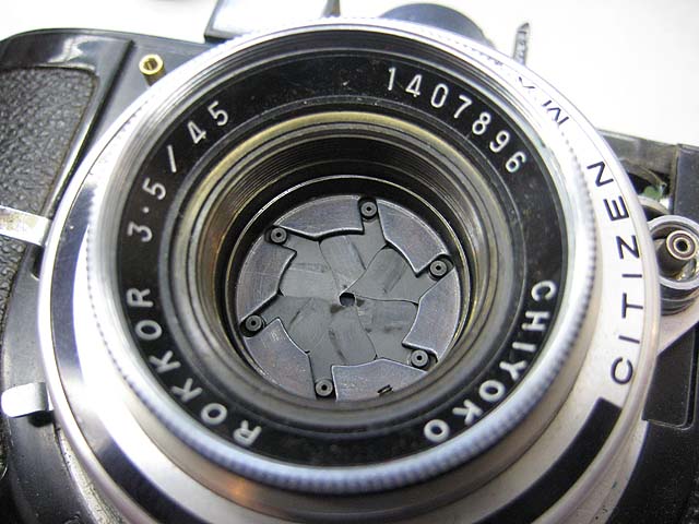 上のネジを外すと、 巻き上げレバーを留めている2本のマイナスネジが見えますのでこれも外します。 巻き上げレバーには、巻き上げ軸が戻るためのテンションがかかっています。ですからレバーを外すと軸が戻り方向に回っていきます。 巻き戻しノブは特に何も有りません。 軸の回転を固定して、ノブをゆるみ方向に回せば外れます。 外れた状態がこちら。 ノブの下に矢印Aのワッシャが有ります。矢印Bは巻き戻し軸を上下にスライドさせるためのガイド兼ベアリングです。 分解の時この部品は外さなくてもいいと思います。外してしまうと、軍艦部カバーを開けないと戻せなくなります。 あとは、両サイドと、後ろ真ん中のマイナスネジ、合計3本を外せば軍艦部カバーは外れます。 巻き戻しのガイドを外さない方がいいと言ったのは、 こうなっているからです。 矢印のクリップで、ガイドを押し込んだ時のクリックをしているんですが、このクリップを開いてやらないとガイドが入らないんです。だから軍艦部カバーがかぶさっていてはクリップを開くことができないから、ガイドをはめられないのです。 それと、軍艦部カバーにはシャッターボタンがくっ付いています。 矢印Aがシャッターボタン。Bがレリーズに押されるパーツ。 もうちょっと詳しく説明すると、この矢印の部品がシャッターボタンで、ワッシャがかしめてあるので抜けません。 しかし、一つ前の写真の矢印Bの部品はスポッと取れてしまいますので分解組み立ての時に落としやすいです。 それから、巻上げ部はこうなっています。 巻き上げ軸自体には戻りの回り止めがありません。だから巻き上げレバーを外すと、この巻いてあるスプリングのテンションに任せてゆるんでしまいます。 組む時はテンションがかかった状態を維持してレバーを付けなければいけないでしょうね。 次に軍艦部真ん中。 連動距離計とシャッタースピードダイヤルが有ります。 この写真の下方向がカメラの前です。 この写真で右側がファインダーの経路。左側が二重像のための経路です。 ファインダーの経路に有る45度の部品がハーフミラーです。 距離計の調整は、 アクセサリーシューのカバーを外せばドライバーが入れられそうですね。 それから、カメラ前面のレンズ周りのカバーは、 X接点のリングネジを外して、残り3本のマイナスネジを外せは簡単に外れます。 外した状態がこちら。 でも順番から言うと、先にレンズ鏡胴のカバーを外すべきです。 この作業ではピントリングの指のかかりの部品を外しています。本来ならそれは外さずに鏡胴のカバーのサイドの芋ネジをゆるめてまずカバーを外した方がスムーズですね。 次にレンズの前玉を外します。 外すと絞りが見えてきます。 外したレンズはこちら。 前玉が外れると、絞りリングも取れますので、そしたらレンズ後群も外せます。 ひっくり返すと絞りがばらけますので気を付けて。 レンズ後群の下には シムが入っていました。 では次にシャッターユニットを外しにかかります。 が、ちょっと長くなりますので、この続きはまた今度。 今回はいつもより詳しく説明しています。 でもミノルタAを持っていて、しかも分解してみようと言う人が世の中に何人いることか。 この記事が誰かの役に立つ事はほとんど無いような気はします。 ま、いいか。