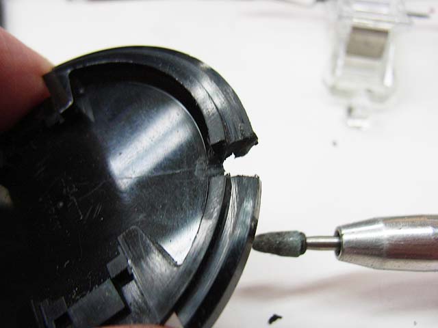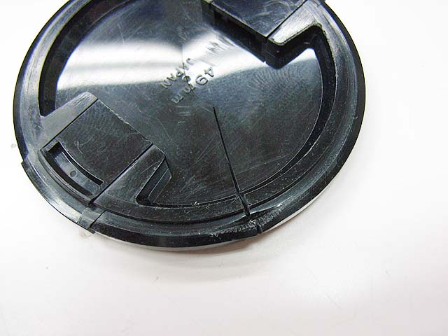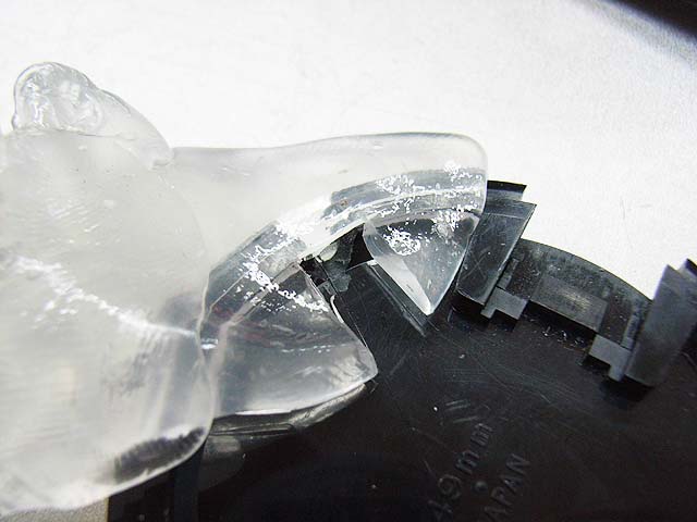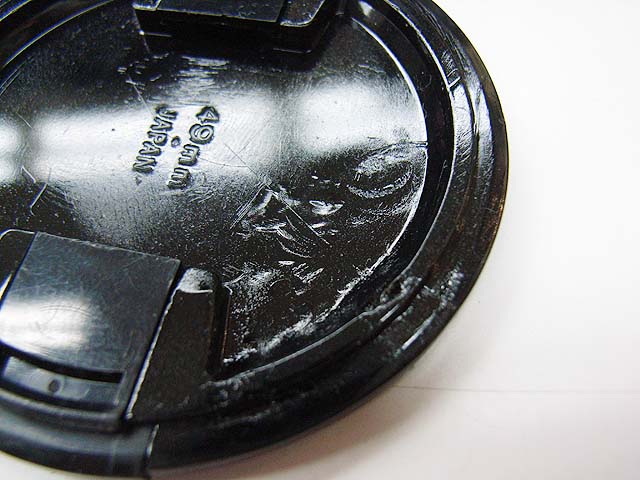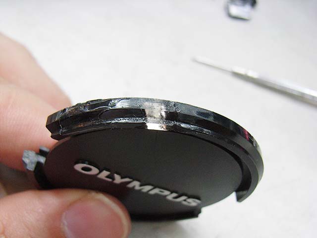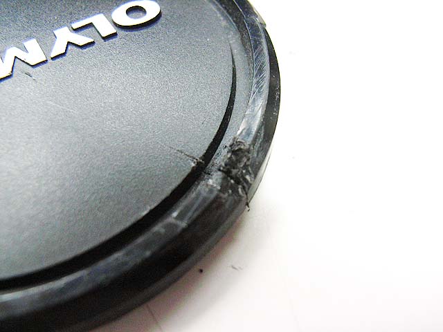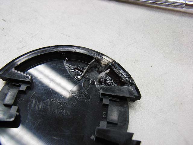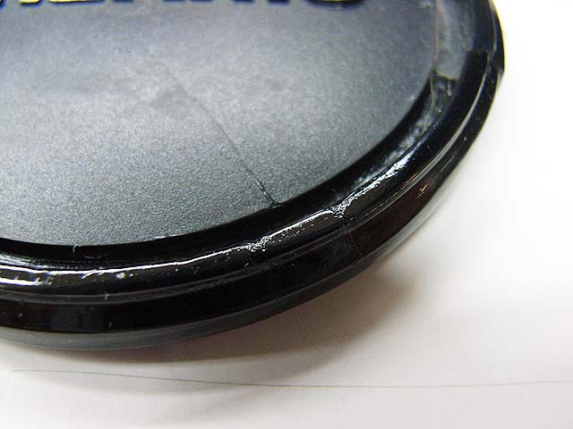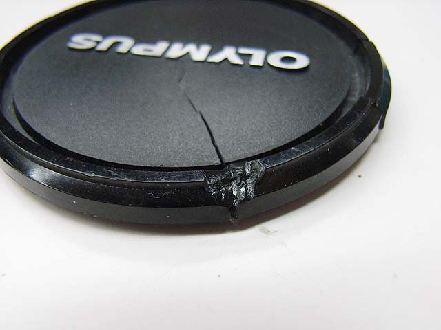 レンズ本体は何とか直しましたが、レンズキャップも割れてかわいそうな状態でしたので、直してみる事にしました。 ぶつかった所が押されて少し開いてしまっている状態です。 だからヒビに隙間ができています。 どうやって直しましょうか。