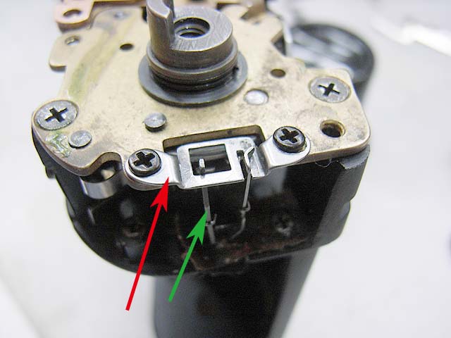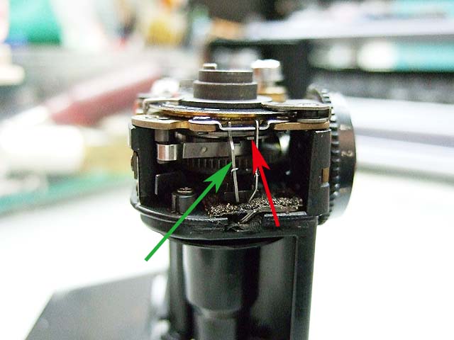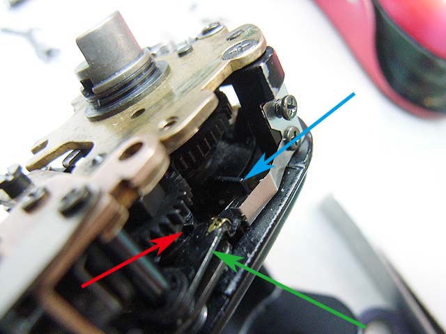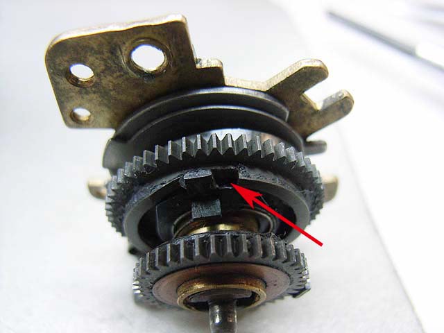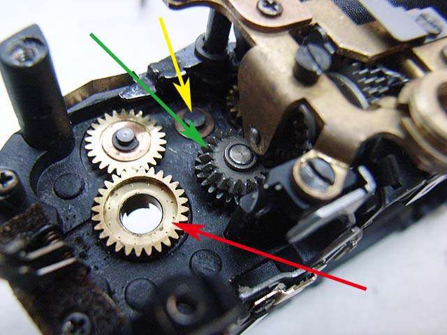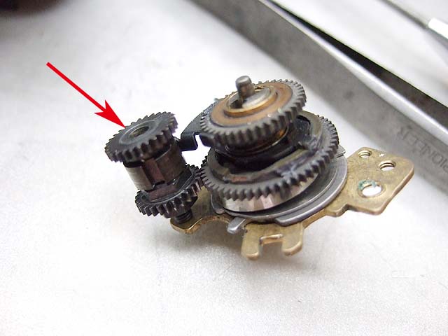 このギアは、完全に巻き上げた時にだけ巻き戻しレバーが返ってくる仕組みのためと、巻き上げた時に露出計のスイッチを入れるための制御を担っています。