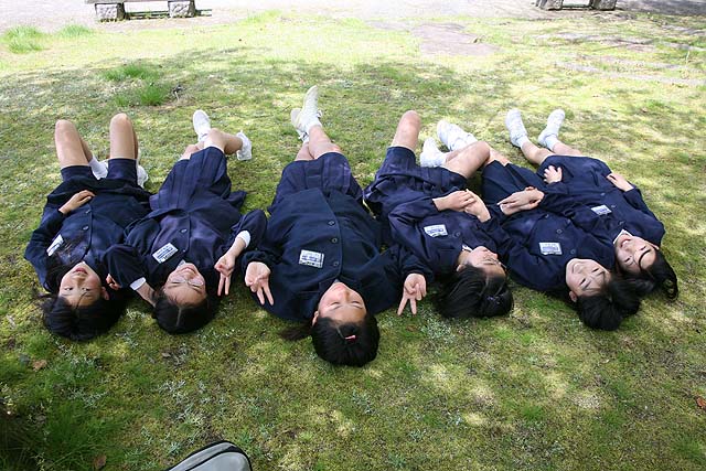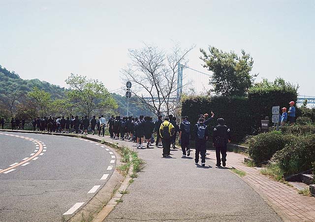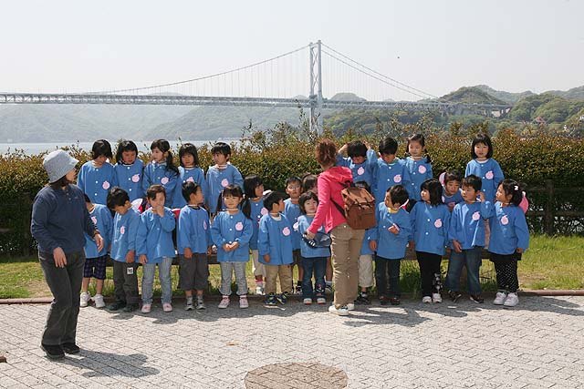 人権平和資料館では、アジアの子ども達が書いた絵日記が展示してありました。 日本とは違う生活環境の子どもたちのことをリアルに知ることができます。 でもやっぱり遠足の醍醐味はお昼のお弁当でしょう。 そして、食後の自由時間。 この子達は、芝生に寝転びたいんだって。 普段そんなこととは無縁なんでしょうね。 とっても楽しそうです。 一方、遠足に行くのは何も小学校だけでは有りません。 因島大橋の近くまで行く幼稚園もあります。 ではでは、集合写真を撮りましょうか。 で、尾道高校のあるクラスでは、向島をグルッと歩いて回るところもあったようです。 幼稚園と遭遇して挨拶を交わしています。 尾道高校が向島に来てからなんか楽しくなった気もしますね。 遠足楽しいね。
