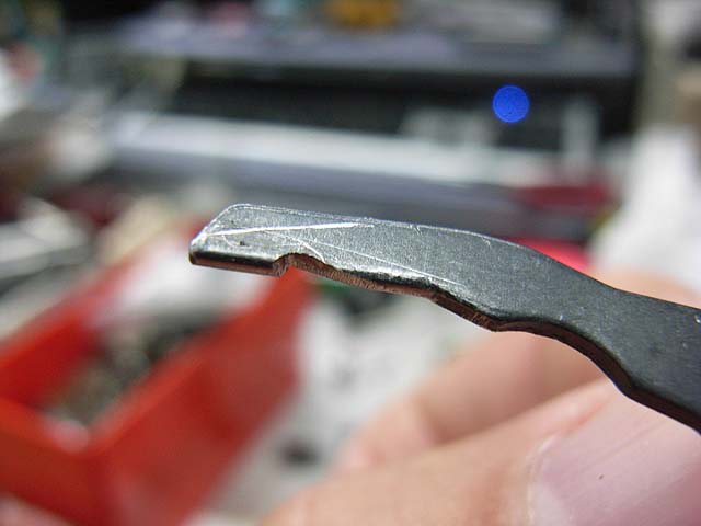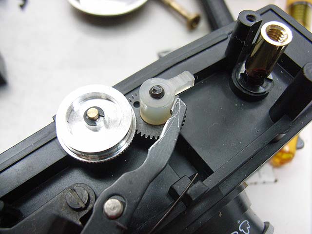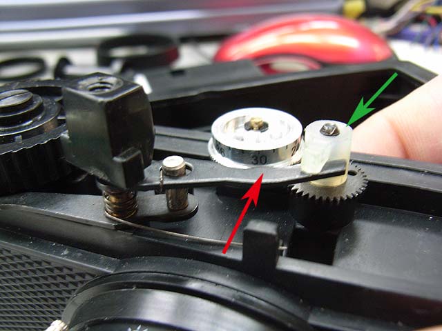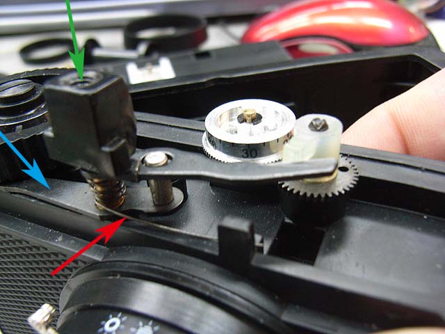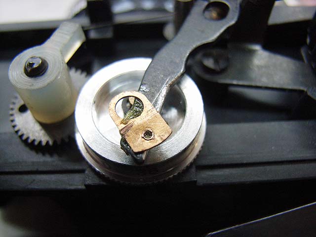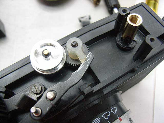 まず、フィルムが巻き上げられると、フィルムのパーフォレーションによって、上の写真の半透明の樹脂の部品が赤矢印の方向に回転します。