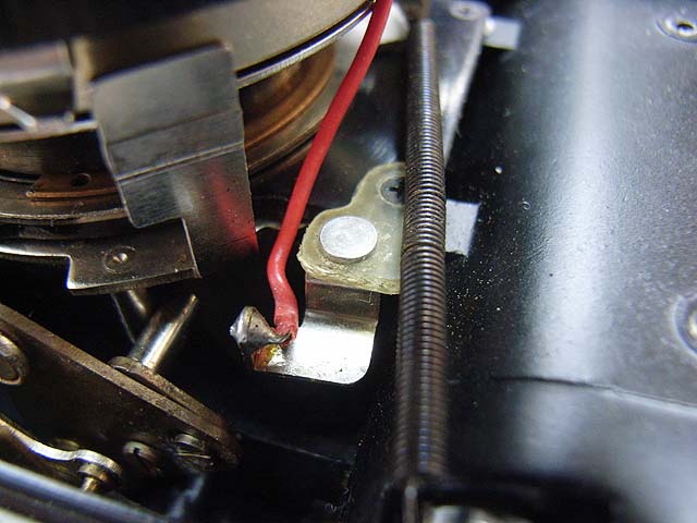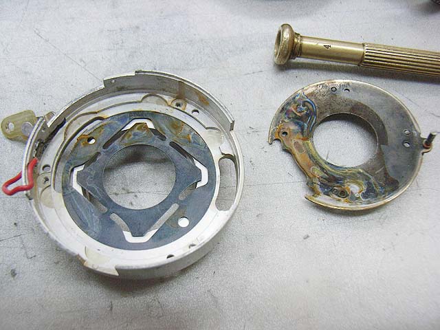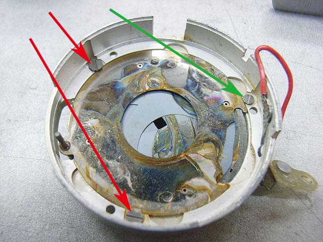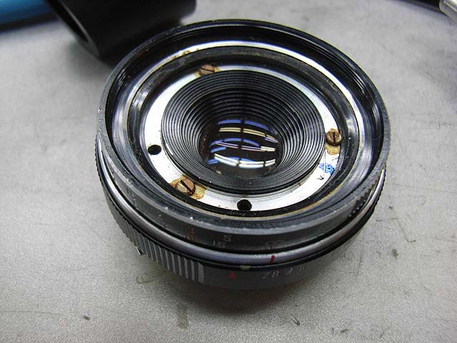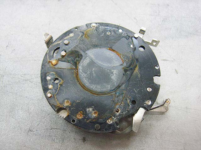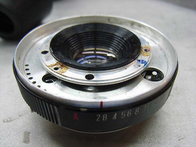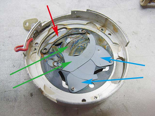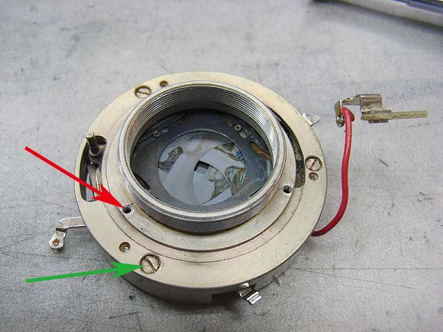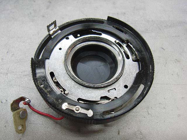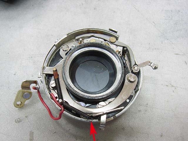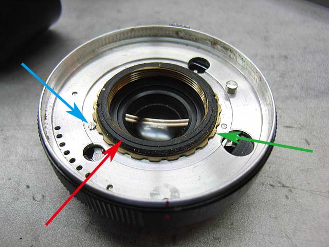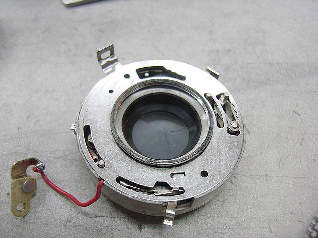 と、その前に、 シンクロの接点を外しておきましょう。 カメラを前から見てレンズの右下にあります。 赤い線がつながってるやつです。プラスネジ1本で留まっています。 レンズユニットが外れたら分解に取り掛かります。 まずは化粧板を取ります。 接着剤で留まっていますが、一箇所切り欠きがありますので、そこを取っ掛かりにして持ち上げるようにするといいと思います。 そしたら次はフォーカスリングを外しましょう。 フォーカスリングを外すには、上の写真で見えます3本のマイナスネジを取ります。 ですが、外してしまうとピントがずれてしまいますので、そうならないためにはどこかにマーキングを入れておくといいでしょう。 そしたら今度は前玉を外しますが、ピントのずれを防ぎたい場合はここでまず前玉を締め込み方向に止まるまで回します。 止まったところまでの回転数と角度を記録しておきます。 そしたら前玉のヘリコイドを緩めて外しましょう。 今度取り付ける時ですが、ヘリコイドのネジは1本でなく、数本あります。ですのではまる溝の位置を同じにしないといけないわけです。それが分かる方法として、先程のヘリコイドの締め込み結果を使うわけです。いっぱい締め込んだ時に同じ位置になるようにヘリコイドのはまり位置を調整します。 そして先程締め込んだ角度だけ戻して、これまた先程マーキングした位置にフォーカスリングを合わせれば、理論上はピントのずれは無いはずです。 が、私の場合はピントの再調整は必ず行いますので上記の色々は行いませんが。 続いて赤矢印の中玉を外します。 今回の個体の場合、かなりきつく締まっていました。ちなみに正ネジです。 これを外したら続いて青矢印のロックネジを回転させてロックを外して、緑矢印のリングネジを緩めて外しましょう。 そしたらリングが色々外れます。 一番上のカバーリングは既に外してあります。 黒いのはシャッタースピードダイヤルです。 うっすら砂が載ってますね。 で、これがガバナー制御及びシャッタースピード設定用のプレート。 これを外せば、 ガバナーが見えてきます。 ちなみに赤矢印のスプリングは先程のガバナー制御用プレートの裏に引っかかるようになっています。 ではいよいよシャッターユニットとケースの分離にかかります。 赤矢印の穴3箇所でネジ留めしてある露出制御用のリングが付いていたんですが、既に外してあります。 緑矢印のマイナスネジ3本を緩めるとシャッターユニットが外れます。 おっとその前に、ここを外しておかないとシャッターユニットが出て来ません。 はい、やっと外れました。 が、結構ひどい状況ですね。 このシャッターは二枚羽根のはずなんですが、錆と砂とかのためにどこにどういう形でシャッター羽根があるのか分かりにくいです。 ではシャッター羽根を外してベンジン浴です。 外したケースの方には絞りがあります。 が、こっちも砂と錆です。 赤矢印と緑矢印の3本で留められたカバーを取れば、絞り羽根を外せます。 こちらが絞り羽根。 一般的に絞り羽根は同じ形状のものが重なり合って、すべての羽根が隣の羽根の下に入り込むようになっていて、順番はありません。 しかしこの絞りはちょっと違います。 まず赤矢印の円弧状のものが一番上にあって、次に緑矢印の先端が長くなっているものが2枚あります。そしてその下に先の短い2枚があるというようなレイアウトです。 何でこんな形なんでしょうね。 ではでは絞り羽根も外して、 その他プレートも全部ベンジン浴行きです。 他の部分も砂とか付いていますので、しっかり洗いましょう。 錆もブラシで落として、きれいになったら組んでいきますか。