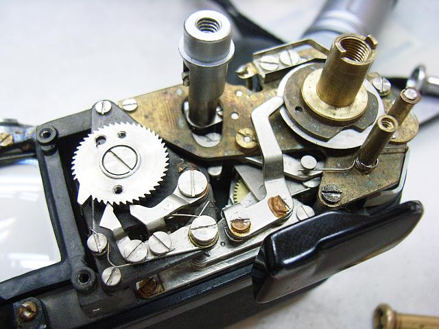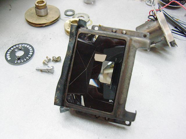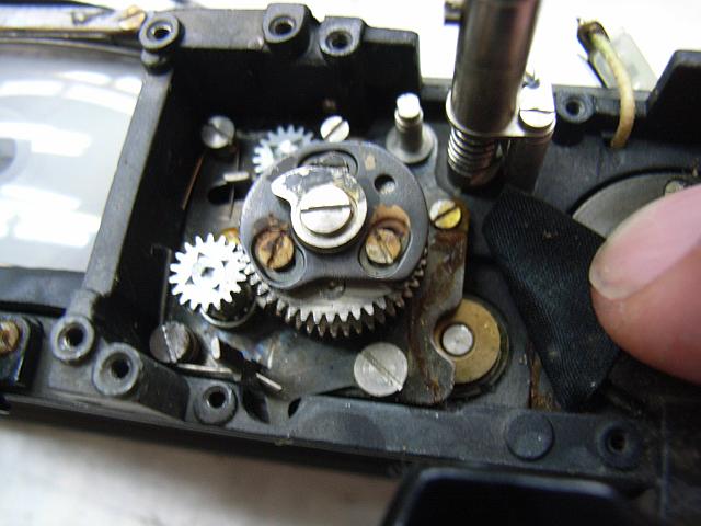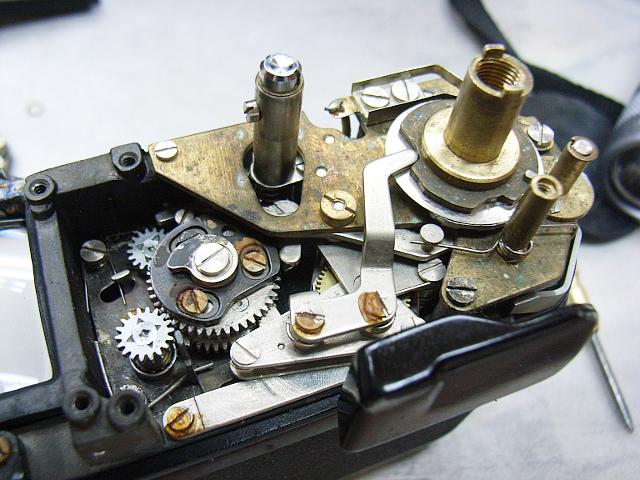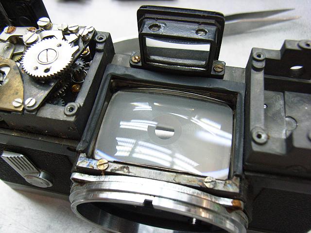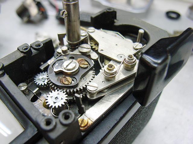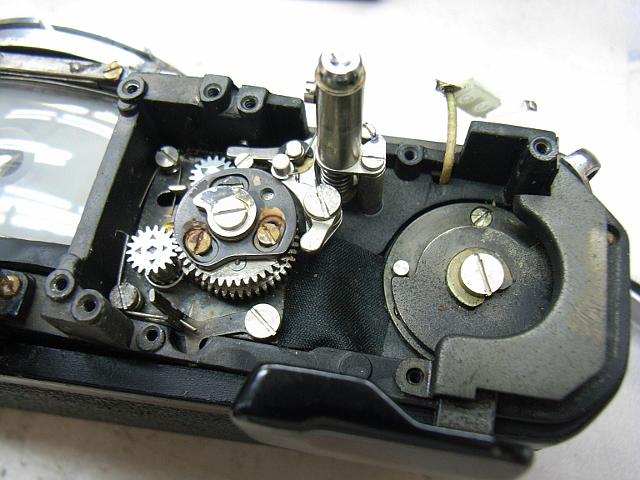 既にシャッタースピードダイヤルと露出計のメーターを連動させるための例の金属帯と、露出計、それからプリズムとマウント周りのカバーは外しました。