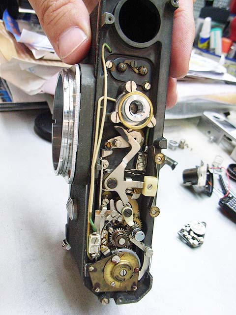 昨日の続きです。 軍艦部を大方バラしましたキャノンフレックスです。 今回は下側をバラします。 このカメラの巻き上げ及び、シャッターセット関係の機構はちょっと複雑ですね。