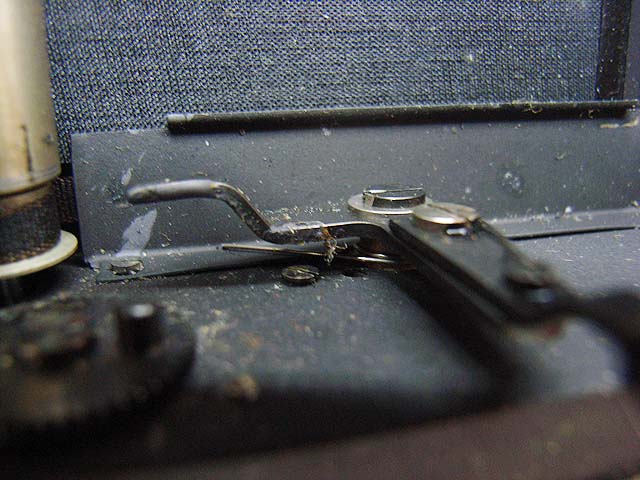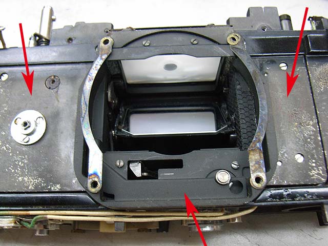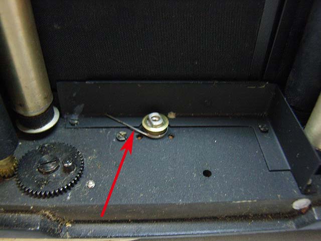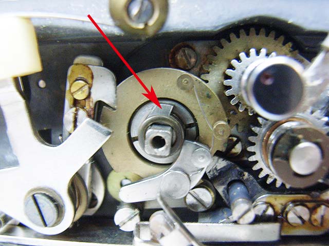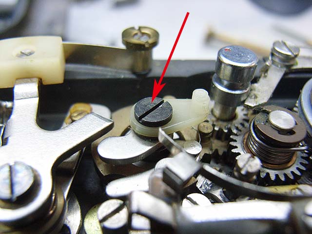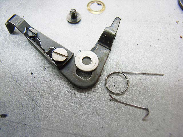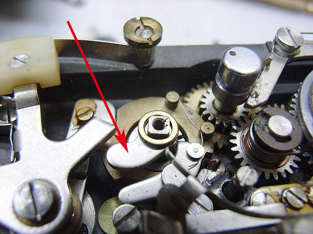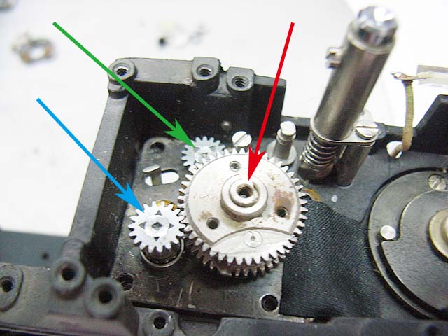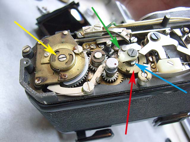 では各部の説明を、 まず、巻き上げレバーで巻き上げると、写真に見えている一連のギヤを介して最終的に赤矢印のリング状の部品を左回りに回転させます。 すると、その部品に付いている緑矢印の部品も一緒に回転します。 回転していくと、青矢印の部品に引っ掛かって、この軸を回転させます。 それによってシャッターセットが行われます。 黄矢印は巻き上げレバーのリターンスプリングです。 ぜんまいバネを使っています。 前の写真で最後に回転させられた軸の反対側は、軍艦部の赤矢印になります。 これが回転させられることで、緑矢印と青矢印のギアが回ります。 青矢印が先幕巻取り用の軸で、緑矢印が後幕巻取り用の軸です。 巻き上げレバーがすぐ横にあるんだからそこから直接つなげればいいような気もしますが、何か深い設計思想があるのでしょう。 ではまた裏に周って、 シャッター幕を外すために、シャッターセット関係の部品を外していきます。 ここのネジを外して、その下の樹脂の部品を取ります。 するとワッシャーと言いますかシムと言いますか。リング状の部品があって、その下にまた金属製のマガタマのような形をした部品がありますのでこれも取りましょう。 これら一連の部品は、この軸の四角の形状からも判ると思いますが、この四角で位置決めしてありますので、今度組む時は間違えないように記録しておきましょう。 そしてまたシムが有って、カム状の部品が有りますので、これも取ります。 で、シャッター幕を外すには他にも色々外さないといけないものが有ります。 マウント自体を外す必要はありませんが、今回はなるべく分解しようと思って外しています。マウントの下にはこのような2穴にまたがるシムと、その下にもワッシャー状のシムが入っています。 ここで本当に外さないといけないのは赤矢印の部分。 と言っても3箇所と言うことではなくて、矢印で示した部分は一体ですので、それをごっそり外します。 その前に上に見えているファインダースクリーンは外しておいた方がいいでしょう。 外さなくても取れますが。 これを外すと、 ミラー室底面に、こんなレバーと、その後に隔壁がありますのでそれも外します。 このレバーは、レンズの自動絞りセット用です。 撮影時の絞込み用のレバーでは有りません。 マニュアルフォーカス末期の一眼レフでもこれと似た形状のレバーが有りますが、その働きはシャッターが落ちる瞬間に設定した絞り値にあわせて絞り込むためのレバーです。 ですがこのカメラのこのレバーは違います。 どんな働きをするかと言うと、絞り関係の部品であると言うことは共通ですが、巻上げに連動してこのレバーがレンズ側の絞込みチャージ装置をチャージするんです。 シャッターを押すと、他の部品がレンズのほかの部品を押して、このチャージが開放されることによって設定した絞り値に絞り込まれると言う、結構複雑なやり方をしています。 では外しましょう。 外してみると、なんかどこにもテンションが掛かっていないスプリングがありますね。 もしかして、 昨日の記事の一番最後に掲載した、どこからともなく出てきた折れたスプリングの残りじゃないですか? 一連の部品を並べてみると、 間違いありません。ここのスプリングが折れていたんですね。 これがシャッター不調の原因だったのかもしれませんね。 じゃぁ、ストックパーツから似たようなスプリングを探してきて、形を修正してセットしてみましょうか。 まあまあ近い形のがありました。 これを組みなおして、もう一度シャッターが切れる状態まで組みなおしてシャッターを切ってみると、 うーん。特に改善されたと言う風でもありませんね。 仕方がありません。 やっぱりシャッターをバラしてみましょう。 続きはまた今度。