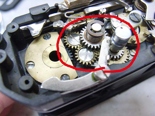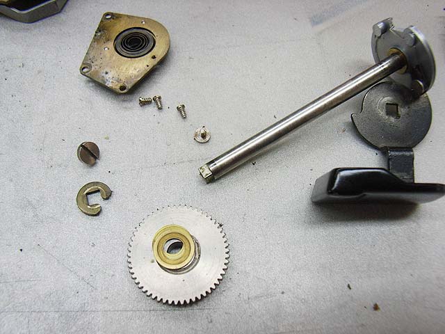 巻き上げレバーを外して、カメラ底部のぜんまいバネを外せば、巻上げ部分の部品は外れます。