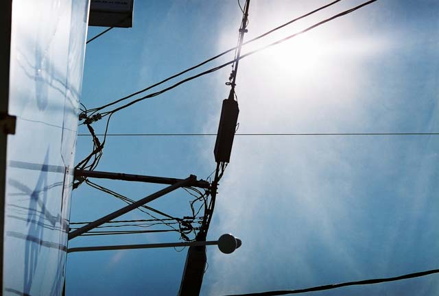 ピントもキリットしている感じです。 ボケ味も悪くないですね。 さすがに一眼レフの標準レンズだけのことはあります。 このキャノンフレックスRMについているレンズは、50mmの1.8。極標準的な標準レンズです。 50mmとしては明るいと言うわけでは有りませんが、その分ピントも合いやすく、使いやすいレンズだと思います。 ただし、最近のオートフォーカスのレンズに慣れた人にとって、この時代のレンズのヘリコイドの回転量はビックリするくらい回すような感じじゃないでしょうか。 そういったこともマニュアルフォーカスでピンボケしにくくするための工夫ですね。 では外に持ち出して、 店の前に置いてある鉢植えです。 こちらも。 いい感じに写ってます。 このカメラは、ファインダーの中には露出の情報など、何の情報のも表示してくれません。 なので、ファインダーをのぞきながら露出をあわせるということができません。 シャッタースピードダイヤルでシャッタースピードを設定したら、カメラ上面にある露出計を見て、そこに指し示した絞り値に絞りを合わせます。 またはその逆。 絞りを決めたら、カメラ上部の露出計で、その絞り値に指針が合うように、シャッタースピードダイヤルで調節します。 空も撮ってみました。 直射日光を入れての撮影もOKですね。 醜いフレアは出てないようです。 いつものアングルです。 思っていたよりおとなしいレンズですね。 コントラストはどちらかと言うと低目です。 この時代としては珍しい気もしますが、個人的には好きなタイプの描写です。 こちらもいつもモデルになってもらっているプジョー406です。 最短撮影距離での撮影は周りがボケやすくて楽しいです。 もう秋かと思わせるような草が風になびいていましたので撮ってみました。 こういう時はもっとコントラストの付くレンズの方がきれいに撮れそうですね。 露出計もOKのようですし、シャッターやミラーの動作のミスも起こりませんでした。 そんなに写りは期待していなかったんですが、なかなかいいですねこれ。 露出計内臓だけど電池も要らないし、クラシック一眼レフを使いたいけど露出計は内蔵されていた方がいい、でも電池に困るからと二の足を踏んでいる人にはお勧めですね。 個人的にはこのキャノンフレックスシリーズのR2000が気になってきた。