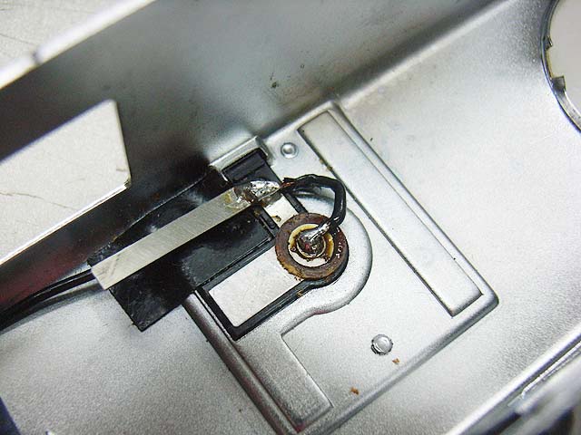 本来なら変形コの字型のシルバーのパーツと、真ん中の丸い部分はつながってないといけませんが、なぜか導通がありませんので、これらをつなぎます。