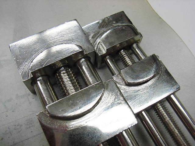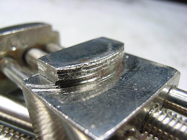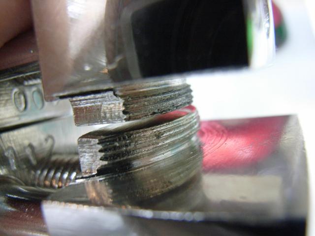 これは万力のようにネジを使って強い力が加えられるようになっているもので、フィルター枠の曲がったところにあてがって、変形を押し戻すツールです。 フィルター枠のネジ部に接する部分は、同じくネジ形状になっており、ネジ部を痛めない構造になっています。 これを使えば、フィルター枠の修理は簡単だと思って購入する事にしました。 フィルター径に合わせて大小2種類がありましたので、2個セットで購入しました。 が、 ご覧になって分かりますでしょうか。 これは、フィルター枠のネジ部に当たる部分なんですが、このツールのネジ部はどう見ても不完全です。 角度を変えてみると分かりやすいでしょうか。 なんか鋳物で造ってるような感じですが、型が良くないですね。 それにせめてネジ部は型抜きしたままでなく、ちゃんと成形して欲しいものです。 仕方がないので、ヤスリである程度ネジを成形してみました。 で、ミノルチナSの歪んだフィルター枠を直すべく、変形部分にあてがって、押し戻してみました。 が、結構使いにくいんですね。 慎重にあてがわないと、変形部分じゃないところにツールが当たってしまって、まともなところが歪んでしまいます。 まぁこれは練習して慣れるしかないでしょうかね。 それと、ツールのネジ部なんですが、フィルター枠のネジのピッチと、必ず一致すると言うわけでもないようで、なんとなくですが、かえってネジを痛めたようでもあります。 これも練習すればうまくいくようになるかも。 が、 なんかすごい事に気が付いてしまいました。 これを見て分かるでしょうか。 実はツールの裏表にあるネジ部が、大と小で同じアールなんです。 重ねると分かりますでしょうか。 ほらね。同じでしょ。 裏側のネジ部もほら。 同じ。 これじゃぁ大小2種類のツールをセットで買う意味は無いじゃないですか。 うーん。使えない。 小さい方を最大に伸ばした時のネジ部の距離は約87mmです。 ですからこの寸法より小さいフィルター枠であれば、小さい方さえ持っていればOKと言う事になります。 普通はこれで事足りますね。 今回の買い物は非常に残念な結果になってしまいました。 フィルター枠の修理には、このプライヤーの方がやりやすいです。