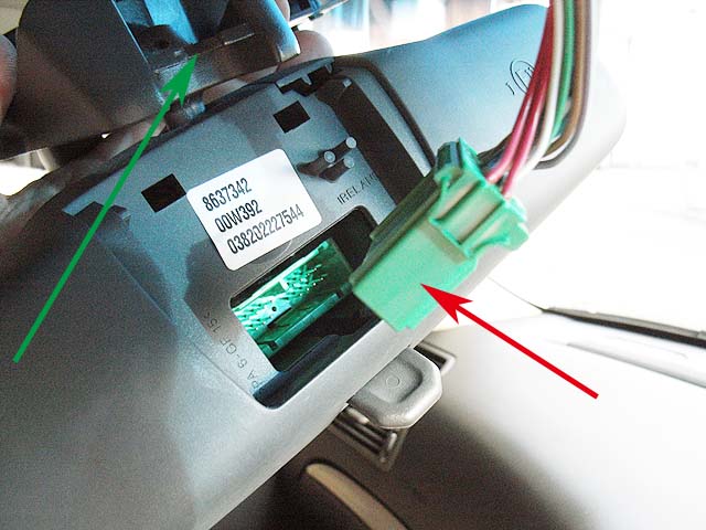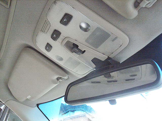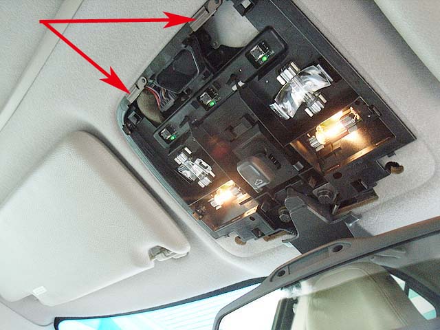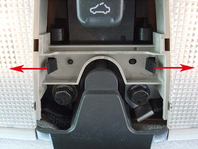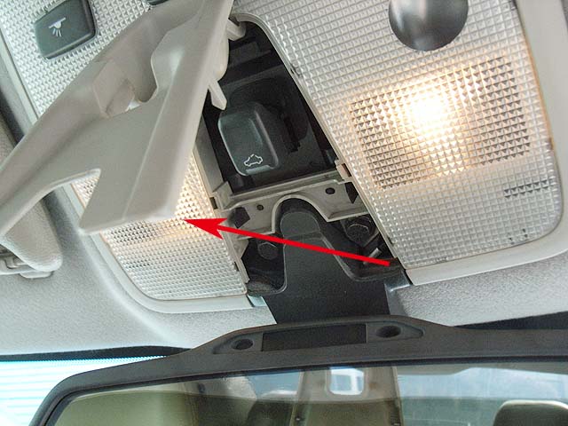 そしたら次に矢印のボルトを緩めて、ぐっと下に引っ張れば、ルームミラーはルームランプユニットごと外れてきます。