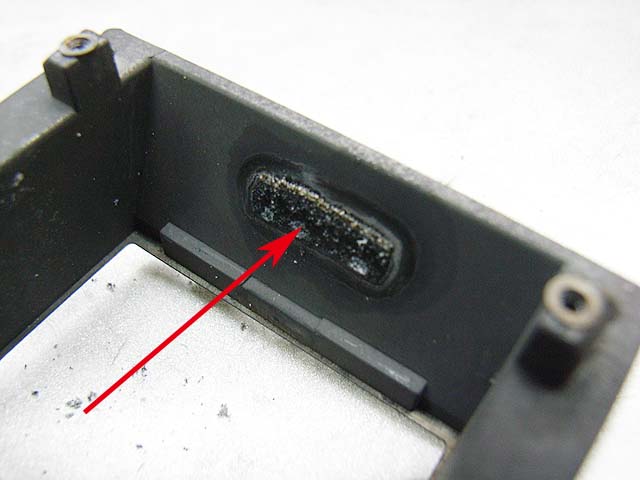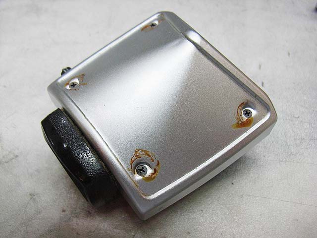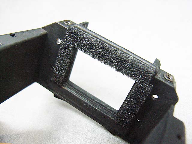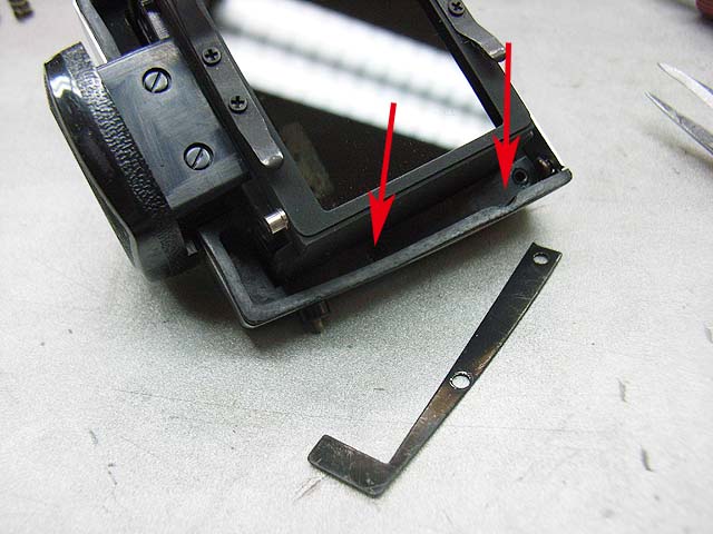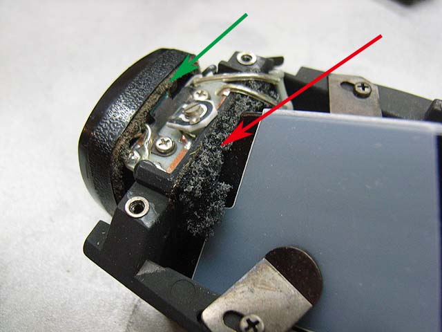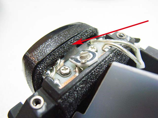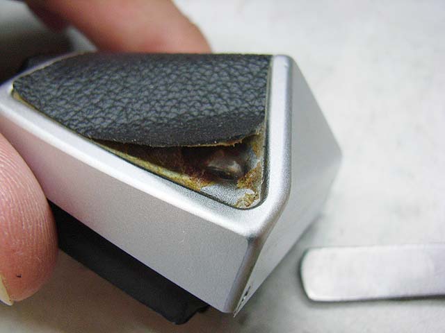裏からプラスネジ2本で留まっているだけです。 が、その隣にあるネジが邪魔してネジを取り去ることが出来ません。 仕方が無いので続いて裏から見えるプラスネジ4本を外していきます。 矢印の部分に2本。 反対側にも2本あります。 ネジを外すと、ご覧のようなプレートが外れます。 その下には成型されたゴムの部品があります。 それらの部品を外したら、上側の貼り革をはがしましょう。 そしたら4本のプラスネジが現れますのでこれを取れば、上側のメッキのカバーが外れます。 あけてみるとご覧のとおり。 赤矢印のモルトはその機能を果たさなくなっています。 接眼部の部品の裏のモルト(緑矢印)も劣化していますね。 ではプリズムを外してみましょう。 ここが問題のモルトですね。 予想通り劣化しています。 プリズム側はというと、 塗装もやられてます。 モルトを直したとしても、ここがこの状態ではあんまり良くないですね。 では悪くなったモルトをはがします。 モルトの貼り替え作業で、一番難しいのはモルトはがしです。 ベースを傷めないように、慎重に、そして丁寧に取り残しなく。 言葉で表現してもあまり伝わりませんので、次に行きます。 きれいにはがした後は、新しいモルトを貼りましょう。 大きさをあわせて切ったモルトを貼っていきます。 当然ここも貼り直します。 接眼部の裏も貼り替えて、内部に散った朽ちたモルトもきれいに掃除して、プリズムも磨いたら組みなおしましょう。 と言う感じで、ファインダーのモルトの貼り替えは終わりです。 次はボディー側の貼り替えです。