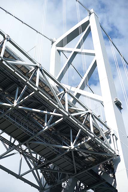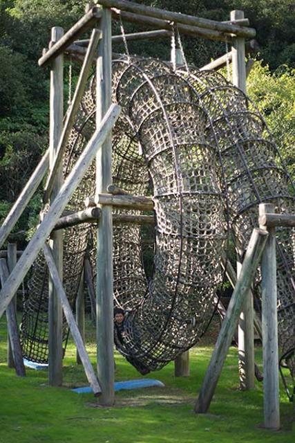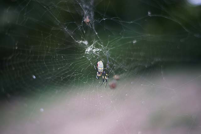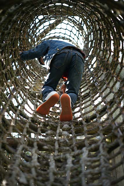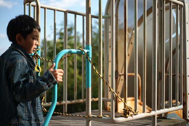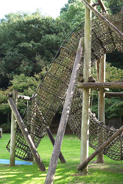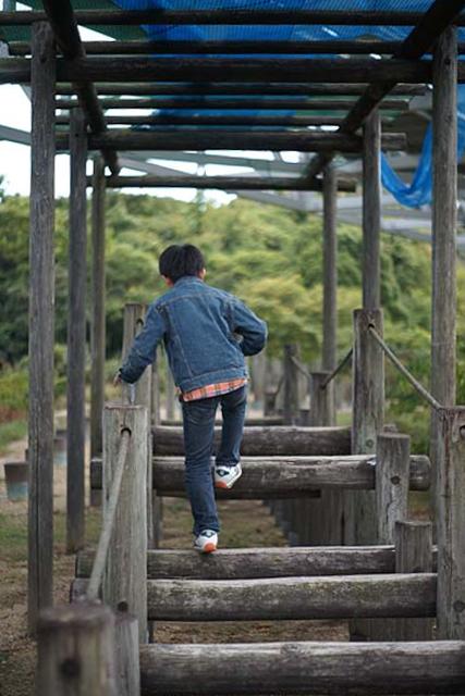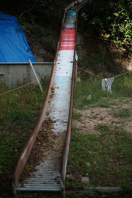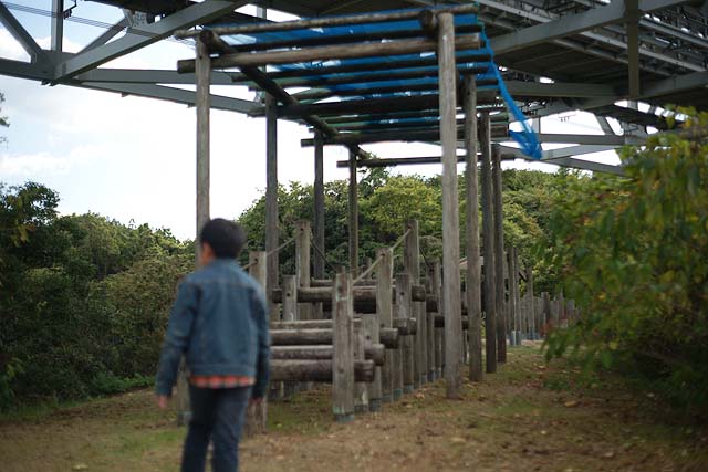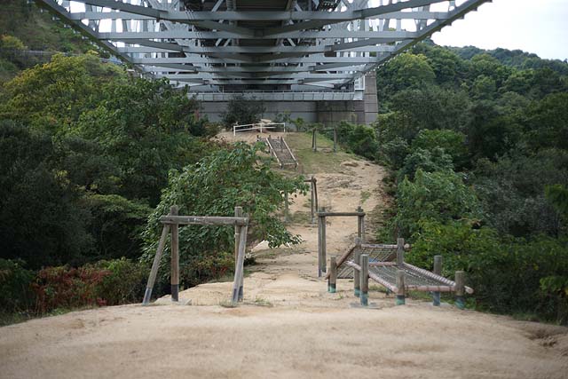 ボクが行きたかったのは因島大橋記念公園。 その中にある「チビッコランド」。 一年生の時の遠足でここで遊んだことがあって、すごい長い滑り台があったからそこに行きたいんだって。 場所は因島大橋の真下です。 駐車場もありますし、ほとんど誰もいません。 最初の写真の遊具が特徴的です。 全体を見るとこんな感じ。 網で出来た筒がグルッと一周した構造です。 何だかスターゲイトのようにも見えます。 中をのぞくとこんな感じです。 何か楽しそうですね。 で、お目当ての長い滑り台はと言うと、 何だか残念なことになっています。 せっかくの設備なのにほったらかしでもったいない。 ボクも残念がっていました。 ここから林道のような道を通って山の上の方に行くと、 滑り台の入り口がありますが、入れないようになっています。 で、ここから更に上に登っていくと、 橋のすぐ裏まで上がることが出来て、そこには遊具が色々あります。 ここからもっと奥にも、 遊具が並んでいます。 が、ここも整備されて無いようで、結構痛んでいます。 まぁ、直したとしても子どもが遊びに来るかと言うと疑問ですが。 でもここからの眺めはきれいです。 寂れている分、 写真を撮るにはいいかも知れません。 遊ぶには邪魔になるクモも、被写体になってくれますし。 今回の撮影はα900 + 50mm,F1.7でした。