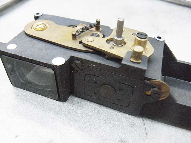 突き出したロッドがピントリングからの動きに連動して、ここにある真鍮製の2つの部品を動かすようです。