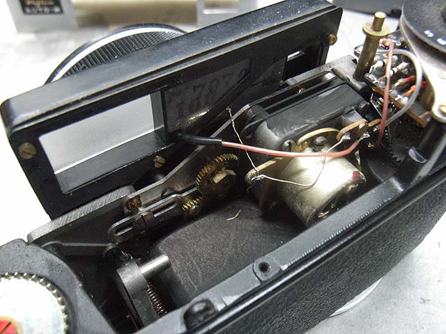 こちらがファインダーユニットを外したボディー側です。左下の方に見えるレバーと突き出したロッドがピントリングの動きに合わせて前後します。