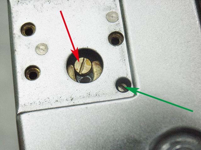 赤矢印のマイナスネジを廻せば、二重像の左右のズレが調整できます。