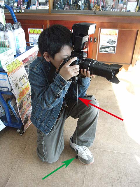 通常の三脚や一脚は柱を立てることでカメラを固定しますが、このステディポッドはその逆で、カメラを手で持ち上げる力でワイヤーを突っ張って安定させようと言うものです。