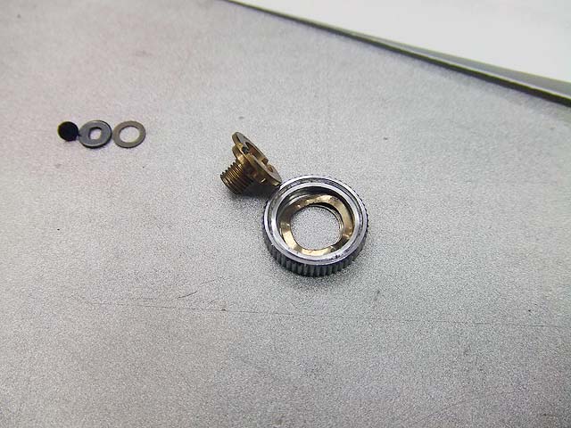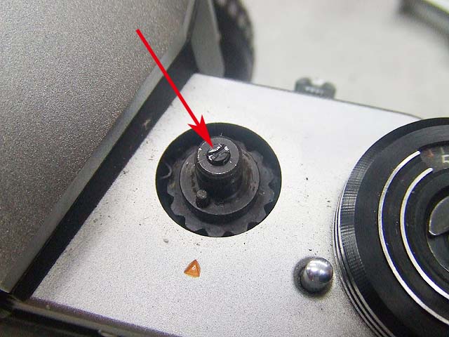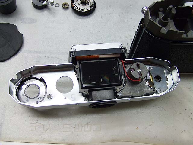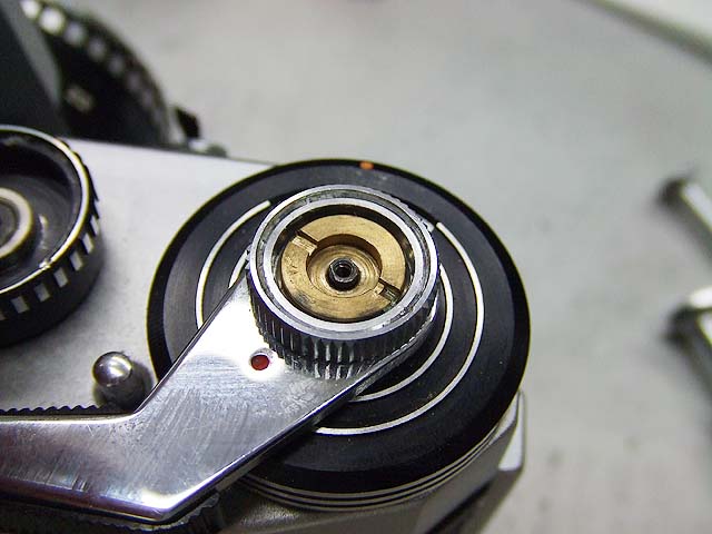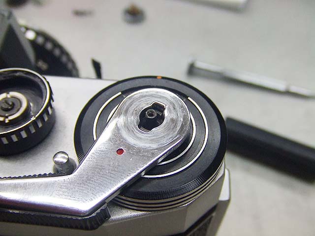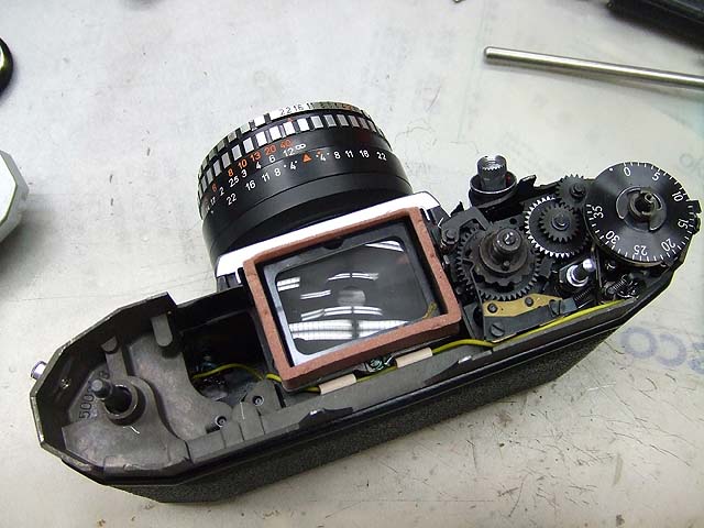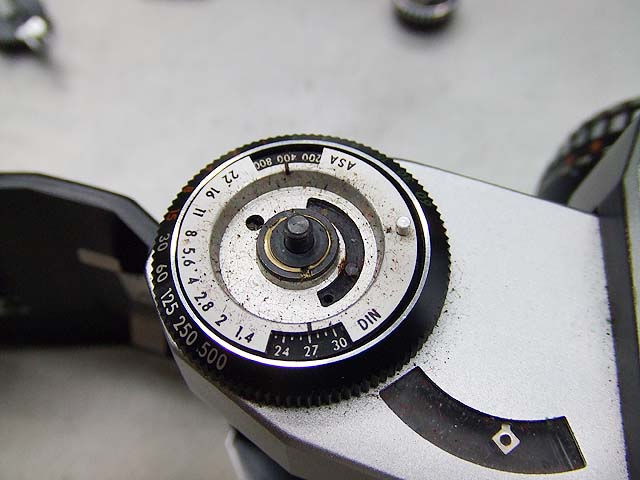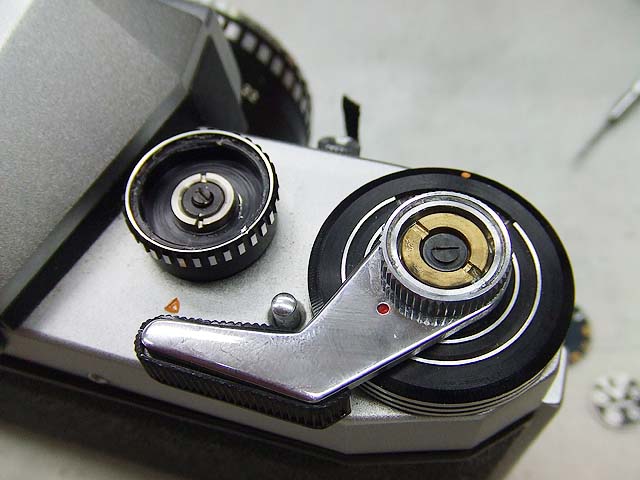 多分誰もが好きじゃないかと思いますが、ネジ部の上にメクラ蓋をしているタイプです。 これをはがすのが簡単ではありません。 しかもこのカメラ、それが2箇所も有るんですよ。 メクラ蓋をはがすには、まずテープを試します。 粘着力の強いテープを貼って、勢いよくはがします。 運がいいとメクラ蓋もはがれます。 それがダメなら隙間にカッターの刃や極細のドライバーなどを差し込んでこじ開けます。 しかし今回のはその隙間もほとんど無く、しかも接着が結構強いんです。 仕方がないので、ドライバーの先がしっかり食い込むように、蓋の端っこを少し掘っていきます。 それでできた穴に細いドライバーを突っ込んで、やっとメクラ蓋が外れました。 では次に巻上げ部を外していきましょう。 まずは真ん中のマイナスネジを外します。 そしたら次に、 カニ目ネジを外して、フィルム種表示ダイヤルを取ります。 こちらが外したネジたちです。 巻き上げレバーを外すとワッシャー状のスペーサーが2枚入っていました。 それを外すと、下からEリングが出てきました。 これを外せばカウンターのカバーが外れるはず。 が、 このEリング、落ち込んだ中にありますよね。 Eリングは横にスライドさせて外すものですが、と言うことは、外すためのスペースが無いと言うことですか? じゃぁ、Eリングは外せない? ??? よく分からないのでここはおいといて、次行きましょう。 シャッタースピードダイヤルを外しました。 赤矢印で示したところにマイナスネジがありますが。ここは外さなくていいです。 巻き上げレバーを外すと、小さいワッシャーが一枚ありますので、それを取って、その下のカニ目ネジを緩めます。 そしたら露出計追針用のダイヤルがごっそり外れます。 その下から出てきた黒いマイナスネジは、ここでは外しません。 まだ巻上げ部にあるカウンターのカバーが外れていませんが、軍艦部カバーの締結ネジを外すと何か進展があるかも知れません。 軍艦部の前後側面にある4本のマイナスネジを外しましょう。 すると、 軍艦部が外れてくれました。 しかもプリズムや、露出計は軍艦部に締結された状態です。 ピントに携わる部分が分離される構造になっているなんて、 大丈夫なの?と思ってしまいます。 問題だったカウンター部のカバーですが、 これもご覧のように軍艦部カバーに付けられていました。 セレンとメーターも軍艦部に付いたまま外れますので、セレンからの配線を外したりする必要がない点では良い設計だと思います。 カメラ側はこんな感じです。 カバーの外れたカウンターダイヤルが見えます。 その隣には巻上げとシャッターセット関係のギアが見えますね。 軍艦部を外しただけでフォーカシングスクリーンにいきなりアクセスできると言うのは、ある意味便利です。 スクリーンの左の大穴は、露出計のメーターの逃がしですが、大袈裟な感じがします。 と言ったところで続きはまた今度。 露出計は直るのか。