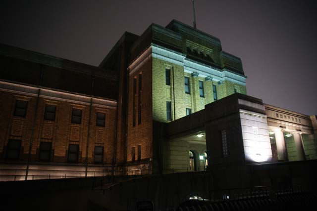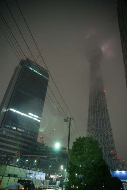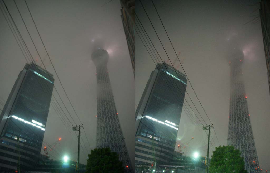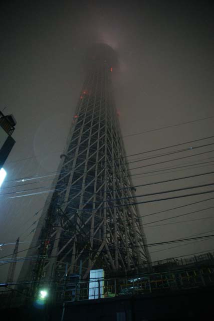 していいのかどうかよく分かりませんでした。 所々にフラッシュ撮影禁止とか、この展示物は撮影禁止です。とか書かれてはいたのですが、それはひとつの展示物固有のことなのか、それともそのフロアー全体のことなのか、よく分からなかったので撮影はしませんでした。 職員の人に聞いてみればよかったです。 ですので、まぁここは撮っても怒られないだろうと思って、建物の真ん中の天井がカッコよかったので写してみました。 照明器具もカッコいい。 歴史のある建物と言う感じがしますね。 で、この国立科学博物館ですが、東京国立博物館よりは規模が小さそうだったので、全部見て廻ってもそんなに時間は掛からないだろうと思っていたんです。 が、結構広くて、一通り見て廻るだけで4時間も掛かってしまいました。 1時過ぎに入館したのですが、出る時には、 もう日も暮れていました。 でもまだスカイツリーには行ってないですよ。 じゃぁ急いで行きましょうか。 でもこんなに暗くなっていて見えるんですかね。 雪も降ってるし、 もしかしてライトアップしている? それに期待しましょう。 駅でどうやって行くのがいいのか聞くと、「業平橋駅で降りたらすぐ近くです」とのこと。 では業平橋駅へ。 駅に着いて見学のチラシがあったのでそれを見るとほんとにすぐ近くのようです。 この後帰りの夜行バスに乗るために新宿に行きますので、その場合に便利のいいもうひとつの最寄り駅の「押上駅」に向かって行けば、途中で見えるはずです。 が、周りを見回してもどこにも見えてきませんね。 でもこの辺にあるはずなんですが… 雪もいっぱい降ってるしな… と思って空を見上げた時、 ありましたスカイツリー。 そうなんです。 スカイツリーは上にあったんです。 完全に視野から外れていました。 我々はスカイツリーの真下にいたんです。 灯台下暗しの逆バージョンです。 こんな感じで。 思わず歓声を上げてしまいました。 でもこの日はあいにくの大雪。 ですので天辺の方と言いますか、展望台のところですら雲の彼方です。 しかしこれはこれでなかなか見れない風景が見れたのではないでしょうか。 押上駅まで行く間、何回も見上げてしまいました。 隣の高層ビルよりはるかに高いのがお分かりでしょうか。 でも後から聞いた話ですが、雪が上の方に積もって、塊が落ちてきていたんだって。 ちょっと危なかったね。 普通に撮っただけではスケール感が分かりにくいとも思いましたので、何コマか撮ったもので擬似3Dにしてみました。 この画像をL判くらいにプリントするか、このままモニターで見るかして平行法で見れば立体的に見れると思います。 普通このような遠景の写真では3D効果は出にくいのですが、さすがはスカイツリーです。 隣のビルよりはるかに高いことが分かります。 今回の東京も面白かったです。 スカイツリーが完成したら、また行ってみたいですね。
