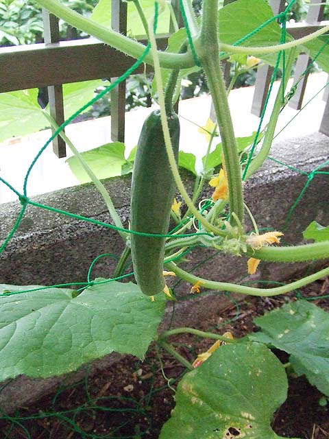 今朝はうちの子がいつもより早く学校に行くんだというので、30分早めに家を出たのですが、その時ついでにうちの子は庭に植えたキュウリたちを見に行っていました。 すると、 「キュウリがなっとる」 と言う大きな声。 見てみると、 本当だ、キュウリがなってます。