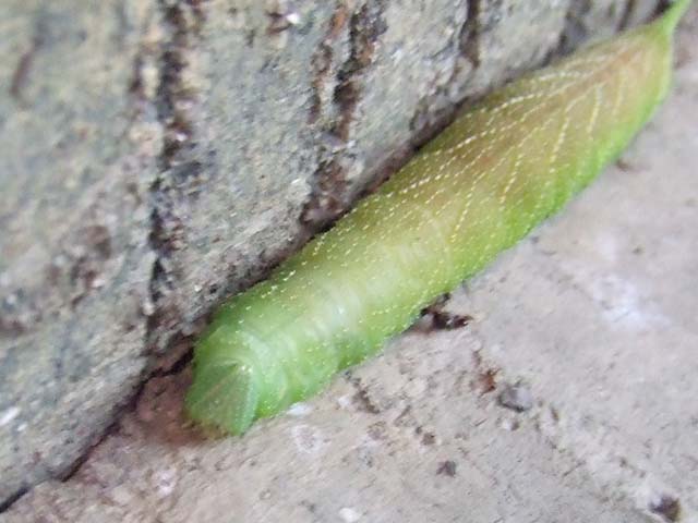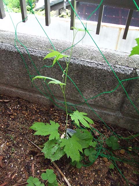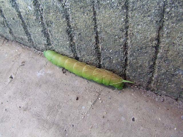 私は毎日水をやってるんですが、やるのはいつも夜なので、キュウリたちの状況を詳しく見てはいなかったんです。 それでたまたま今朝、明るくなってから見てみると、結構立派にキュウリがなっているじゃありませんか。 良く見ると、 もう一本。 まだ花がついている実がありました。 やはりこのあたりが苗の値段の違いなんでしょうかね。 キュウリの苗は確か298円だったと思います。 元々茎も太かったんですが、全体の成長速度も結構なもんで、 すでに私の背を追い抜き、網も越え、屋根に伸びていこうとしています。 このままほっといたら一体どうなるんでしょうか。 それに引き換え、安かった苗の方は、 まだこの程度です。 こちらはゴーヤー。 1個68円でした。 やっと日が当たるところまで伸びてきた感じです。 この先もっと成長して全部の株に花が咲く時期があるかと期待しています。 もしそうなれば、同じウリ科同士、交配が起こって面白い実が出来るかもしれません。 キュウリのように大きな種が出来ないゴーヤーとか、 繊維質のキュウリとか、 無茶苦茶苦いヘチマとか。 ではそのときを楽しみにしておきましょう。 と、その時うちの子の叫び声。 「うわー!」 と言って逃げていきます。 はい、出ました。 ボクの大嫌いなスズメガの幼虫。 約10cmほどのボリュームです。 調べてみると、モモスズメと言う種類のようですね。 うちの桜の木についているんでしょう。 この写真を見せたらまた逃げるでしょうね。