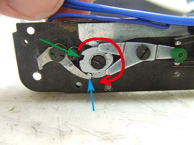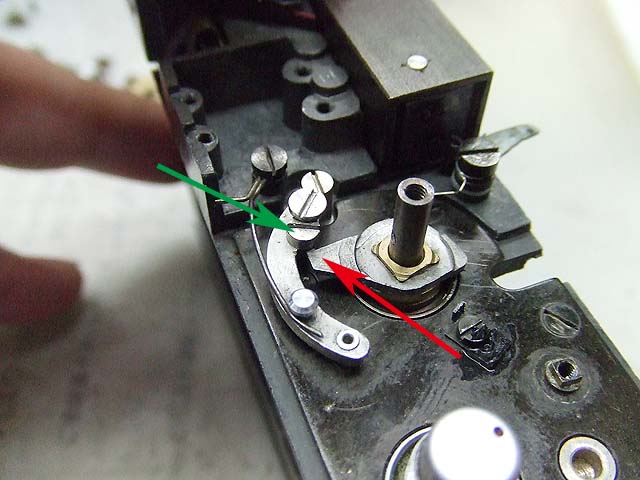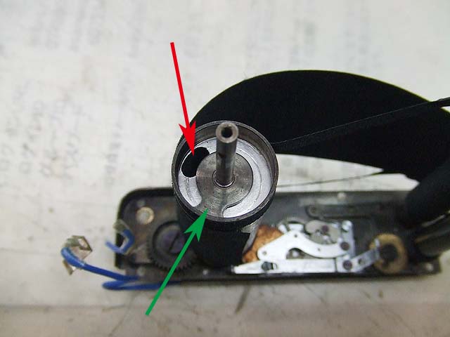 緑矢印のギヤにはこの写真のように溝が掘ってあって、赤矢印の突起で回転範囲を決めています。