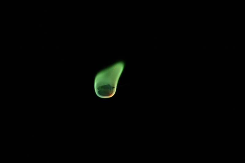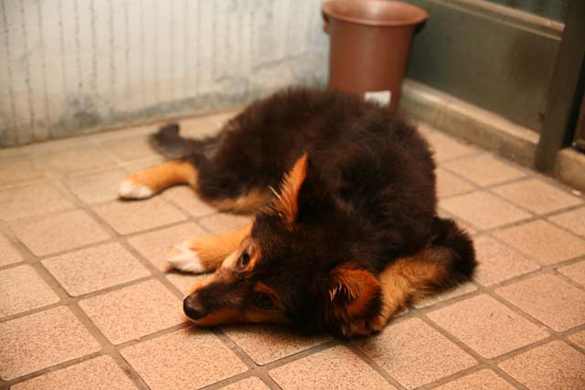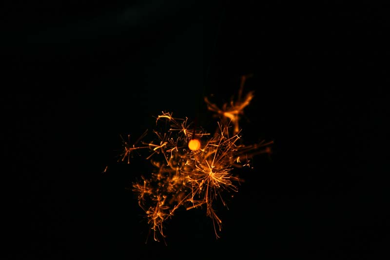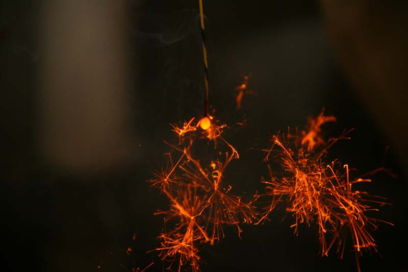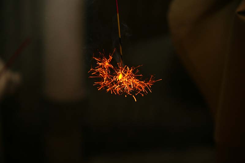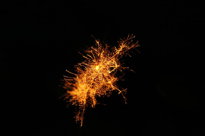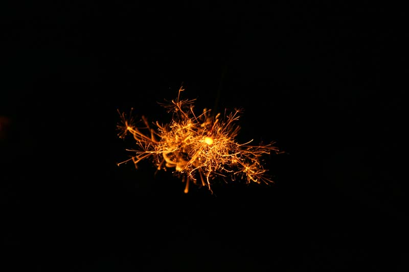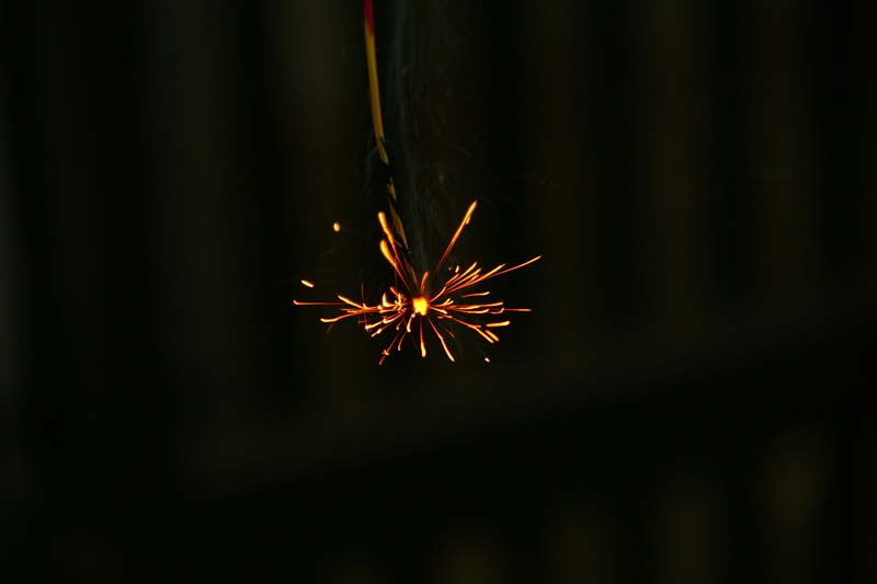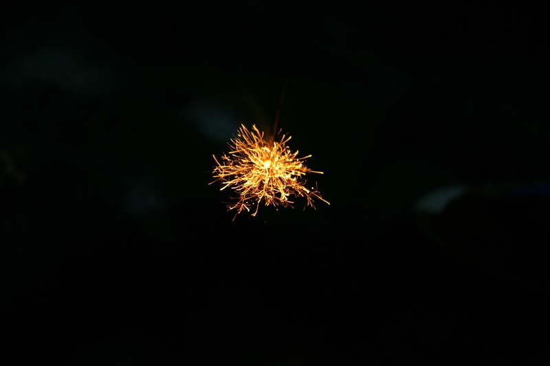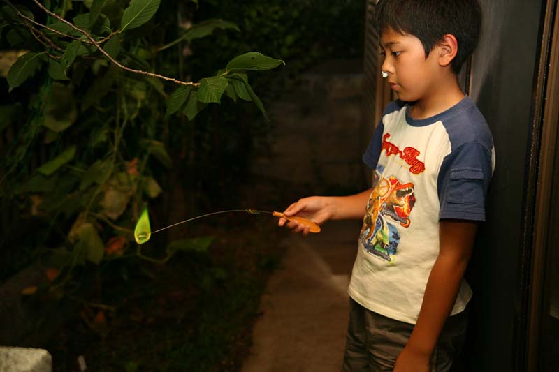 でも撮ったのは線香花火ともう一点だけです。 他の花火は光が強いし、煙がいっぱい出るので結構撮るのが難しいです。 かと言って線香花火は撮影が簡単かと言うとそうでもないのですが、まぁとりあえずやってみました。 露出はオートでは花火が白くなってしまいますのでここはマニュアル露出で撮りましょう。 その前にこんなのも。 夏と言えば怪談ですね。 うちの庭にもヒトダマが出ました。 な、わけもなく、こんな感じの花火もあるってことです。 怪談好きなうちの子としてはこういうモノの方がいいみたいです。 では続いて線香花火を、 シャッタースピード1/10秒で絞りはF5、ISO800です。 露出が決まっても常に花火は変化していますので、何度もシャッターを切ってみましょうか。 これは終わりかけですが、こういう状態もなかなかいいですね。 目で見るほどには綺麗に広がって写りませんね。 ケンは何が起こっているのかという顔で、ちょっと恐れ気味です。 ではちょっと露出を変えて、 もう少し周りの雰囲気が写るようにしてみましょうか。 1/30秒、F6.3、ISO1000です。 もうちょっと周りが写った方がいいですかね。 絞りをもう少しだけ開いてF5.6にしてみましょう。 少し背景が写った方が、やっぱり雰囲気は良くなりましたね。 ところでケンはと言いますと、 退屈になって転がっています。 という感じで線香花火の撮影でした。 今回は一眼レフで撮影しましたので露出の制御はやりやすかったのですが、コンデジででも夜景モードや花火モードにしたり、露出補正をマイナスにしたりするとうまく写るかもしれませんので、是非チャレンジしてみてください。