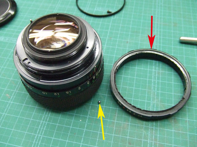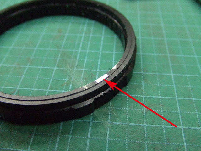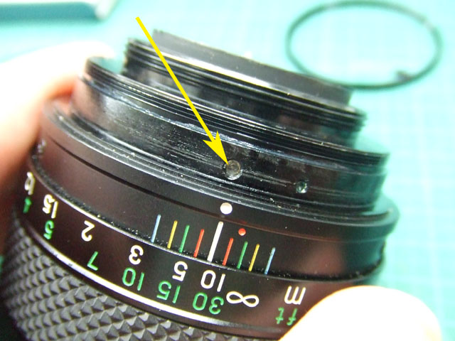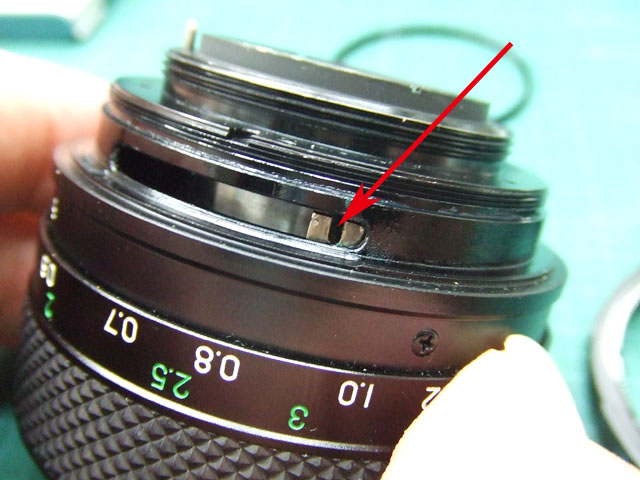 なぜかというと、絞りリングのマウント付近に、カメラとの連動ピンがあって、これがマウントアダプタに干渉して取り付けができないんですよ。